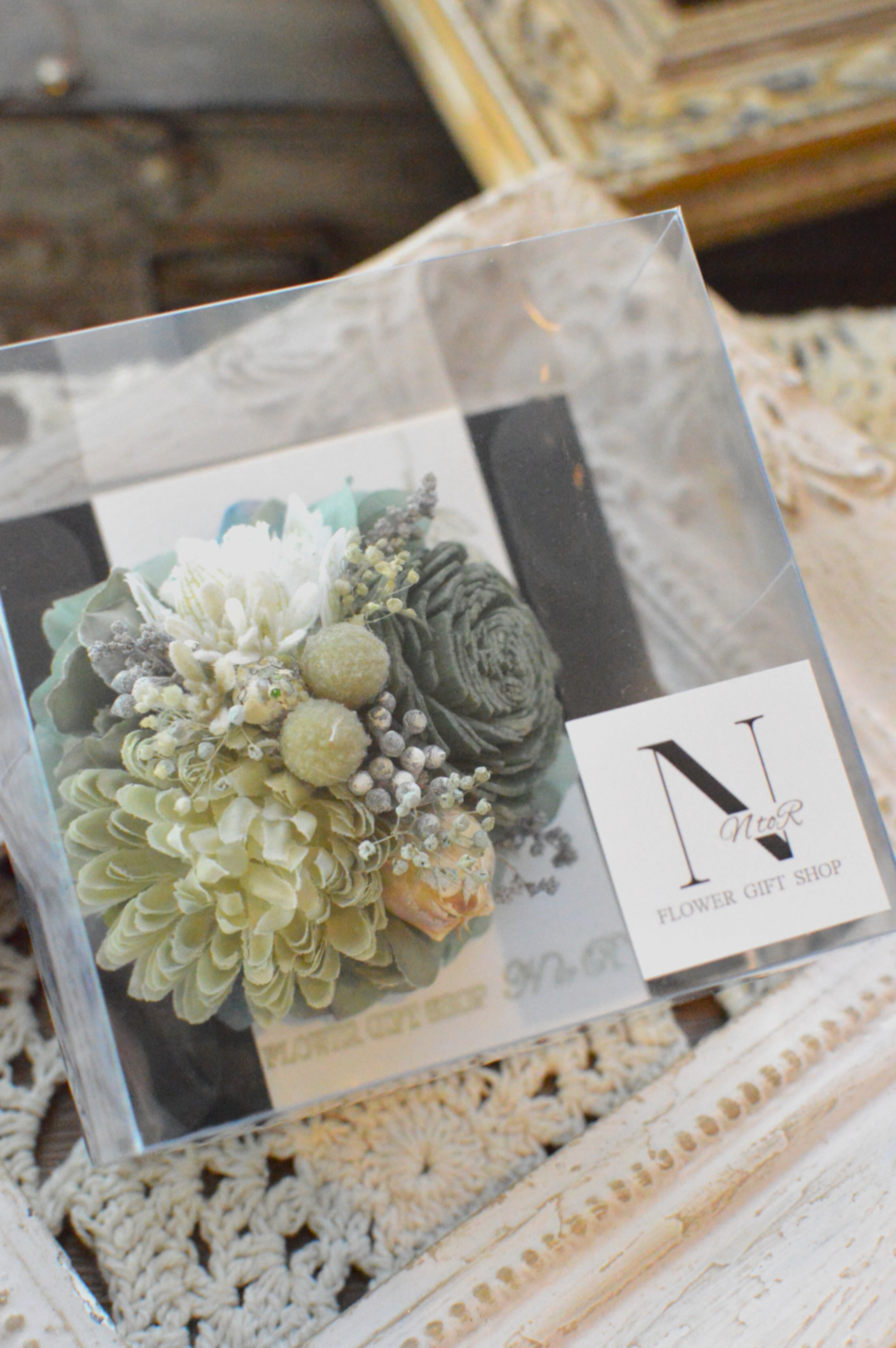 こちらはアーティフィシャルフラワー、ドライフラワー、プリザーブドフラワーを使用して制作しております。
