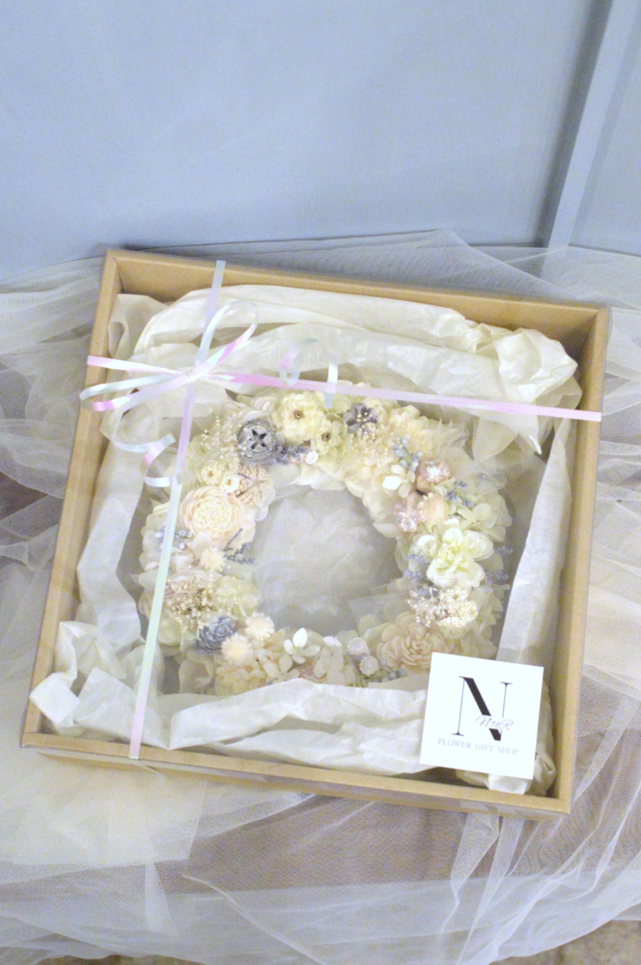 リースは切れ目のない円形になっている事から「永遠」の象徴とされています。特に幸福や生命の永遠を願う相手への贈り物に最適です。結婚祝い、出産祝い、お誕生日、敬老の日等におすすめです。