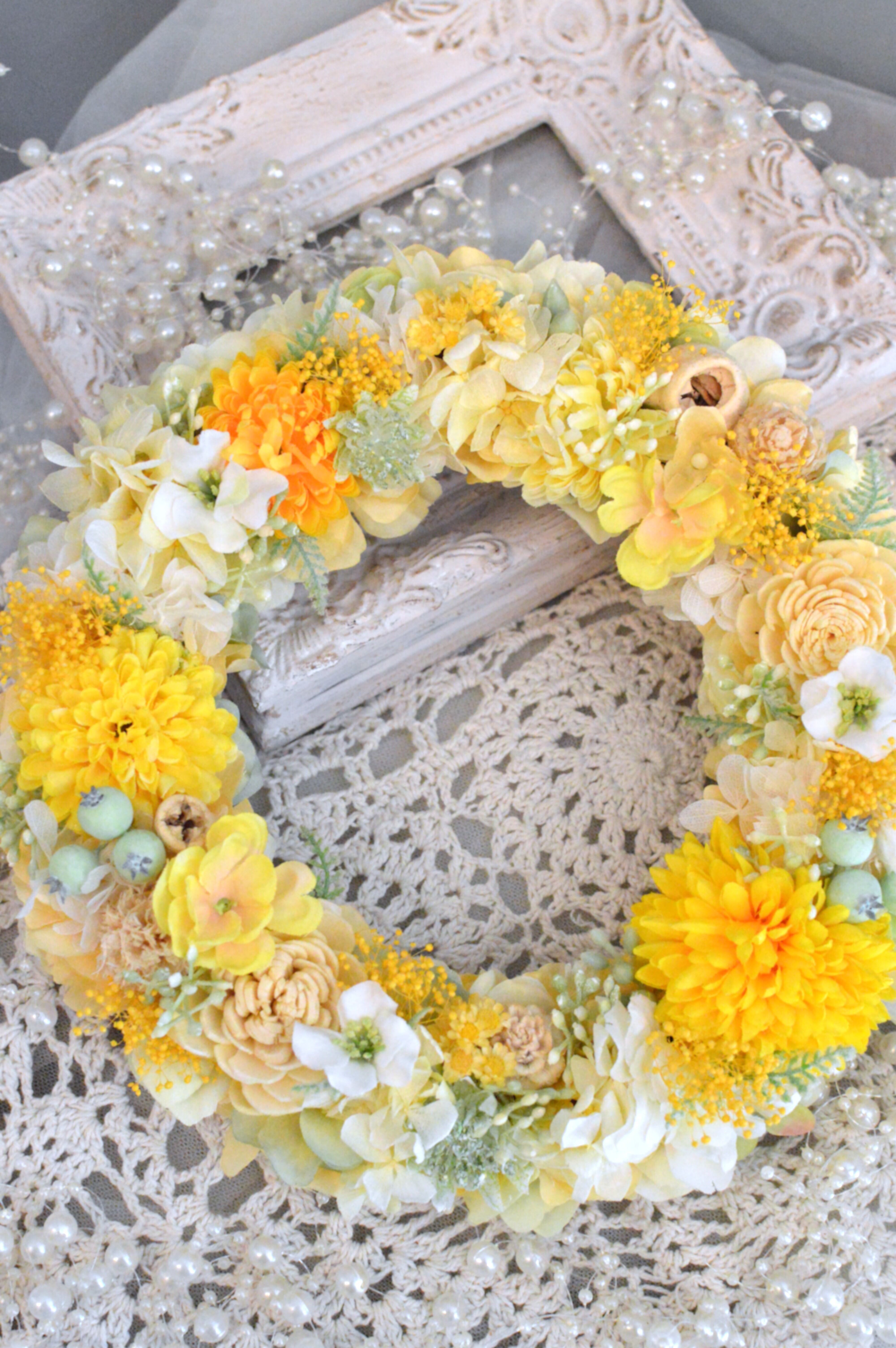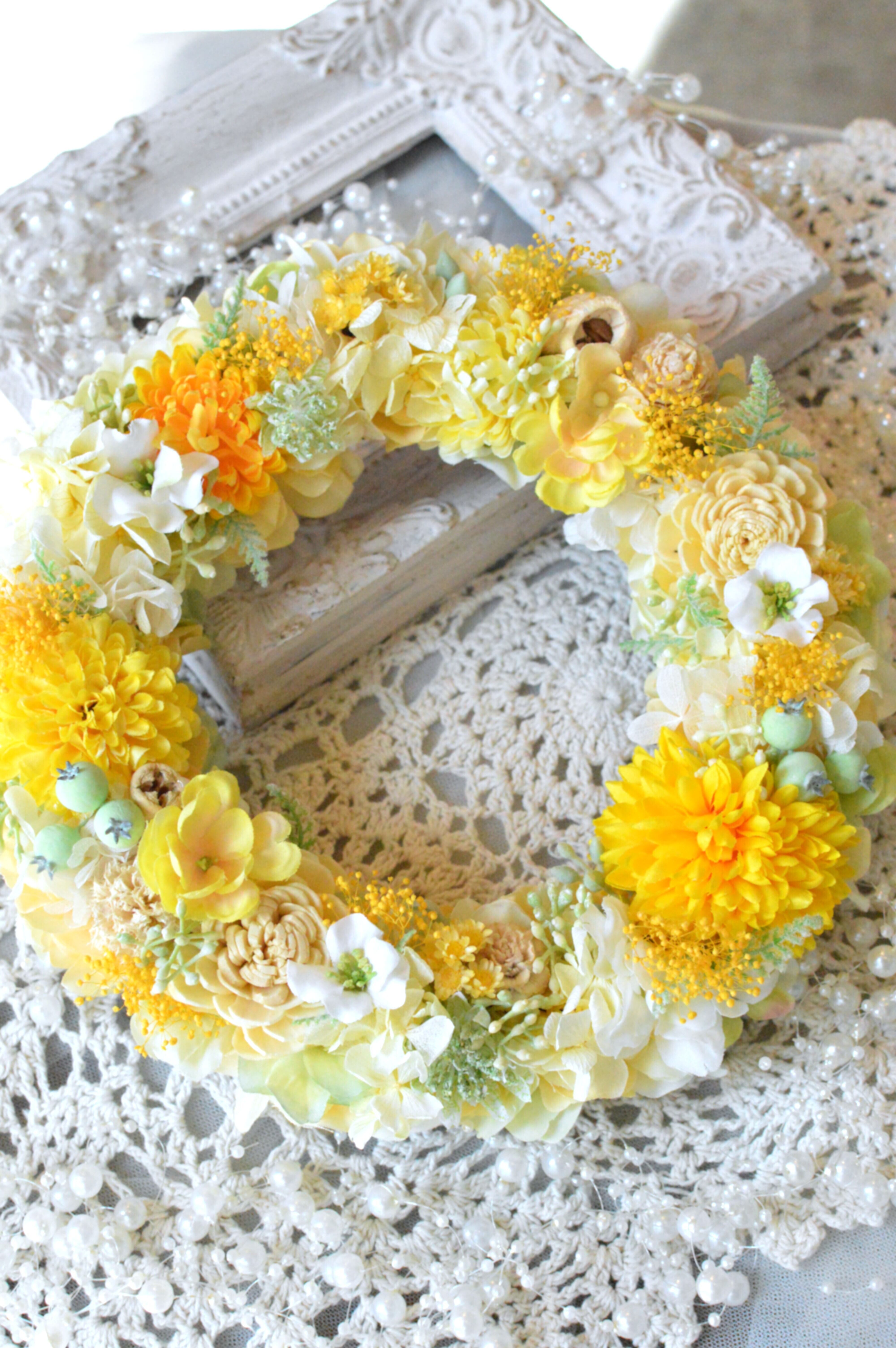 淡めのイエローをベースに、濃いイエロー、淡めのグリーン、ホワイトを組み合わせました。ビタミンカラーが明るく華やかで優しい雰囲気を演出します。