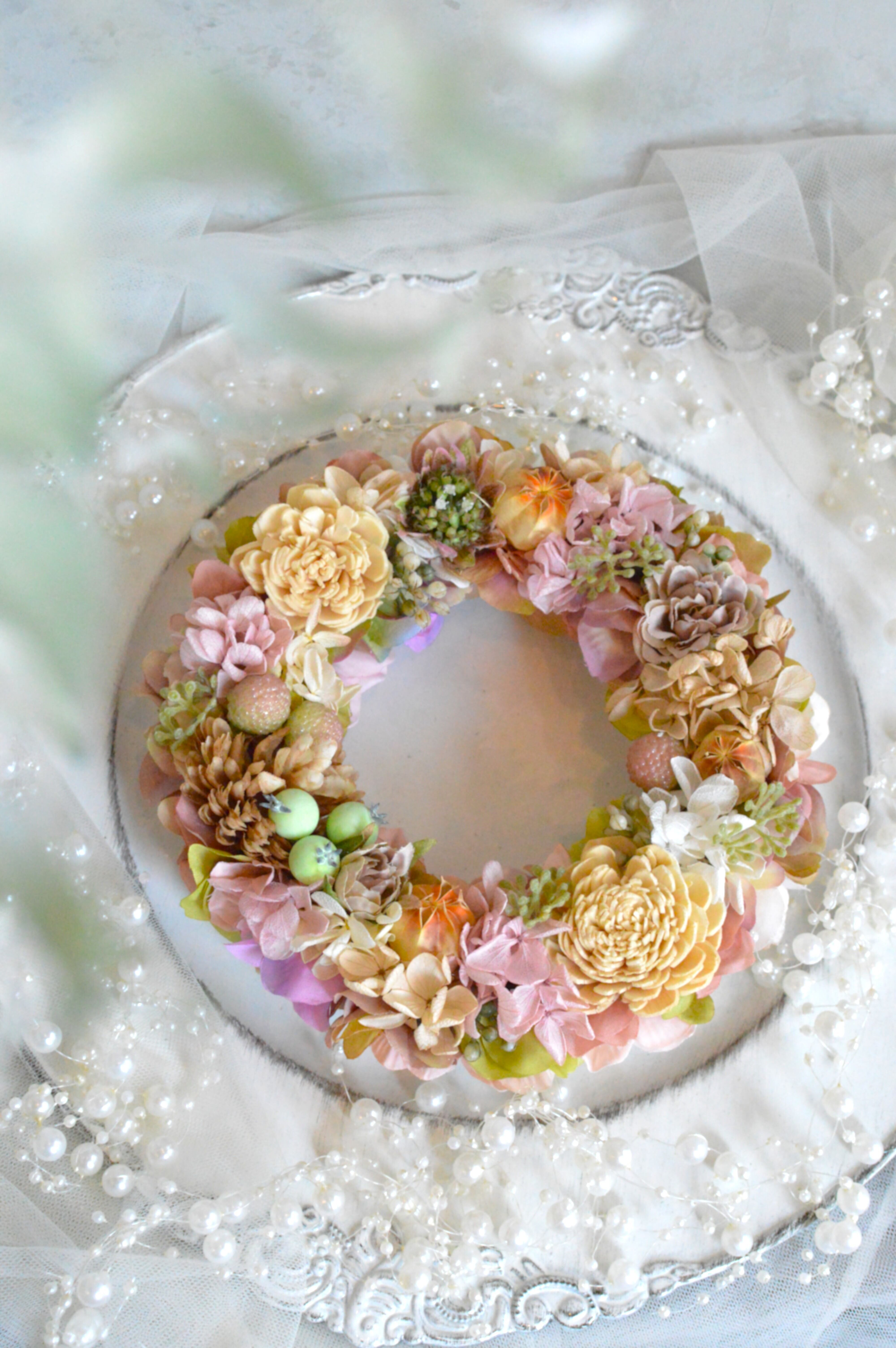 メインはくすみピンクにベージュ、淡めグリーン、ほんの少し白を組み合わせ大人っぽく仕上げました。全体的にくすみ感が強いので、明るく華やかとは対照的に渋めの落ち着いた雰囲気です。