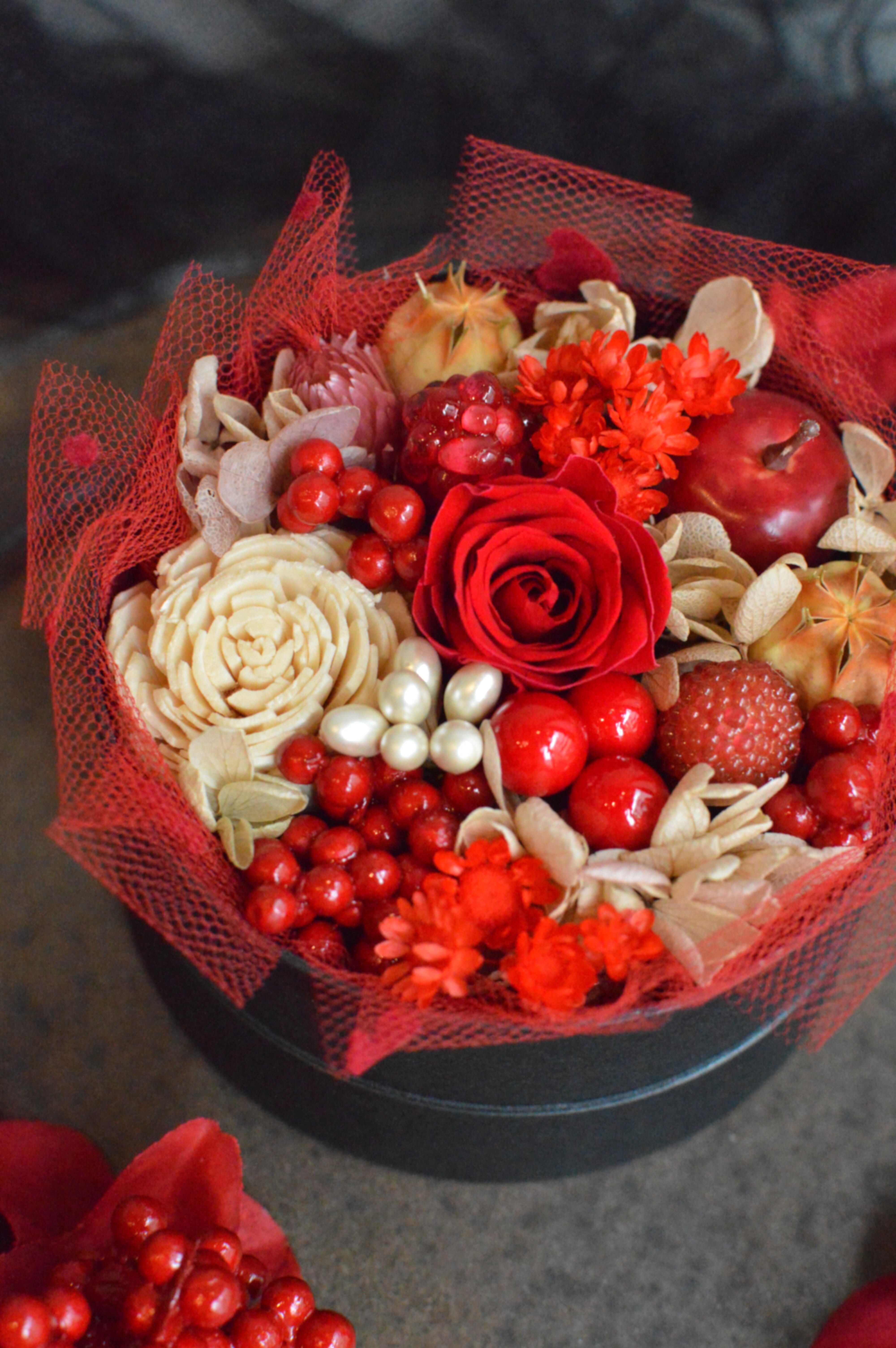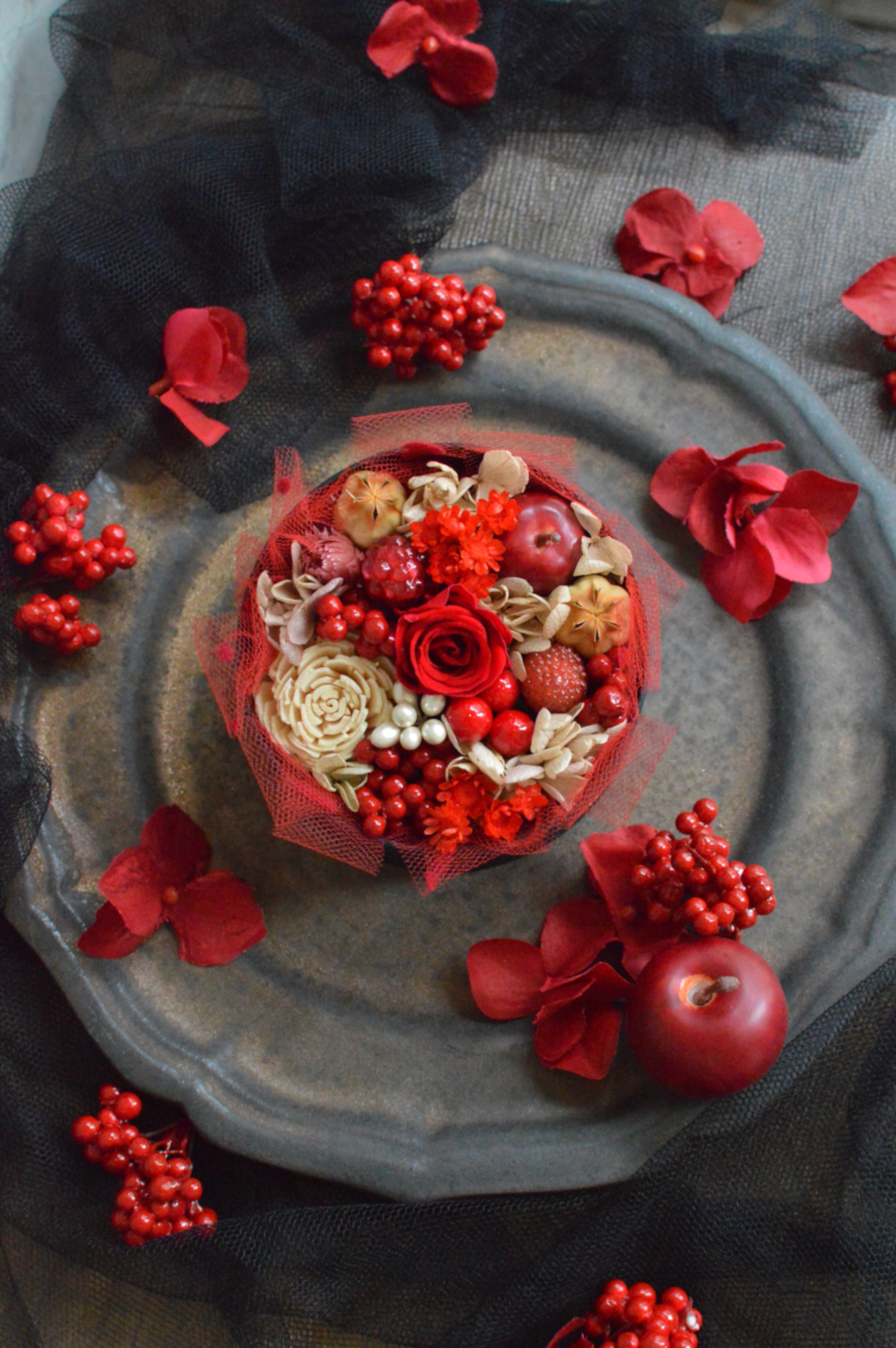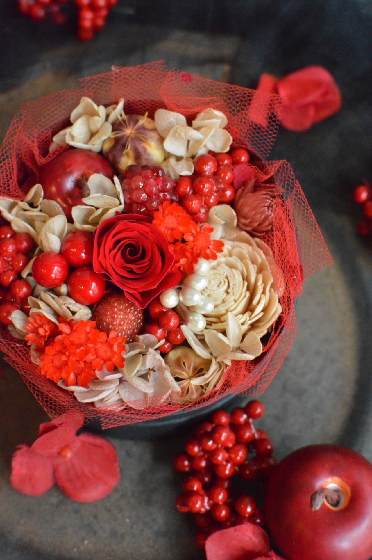 レッドとホワイトで、りんごやベリー、パールビーズ、ドット柄のチュールを組み合わせ可愛く華やかな雰囲気となっております。