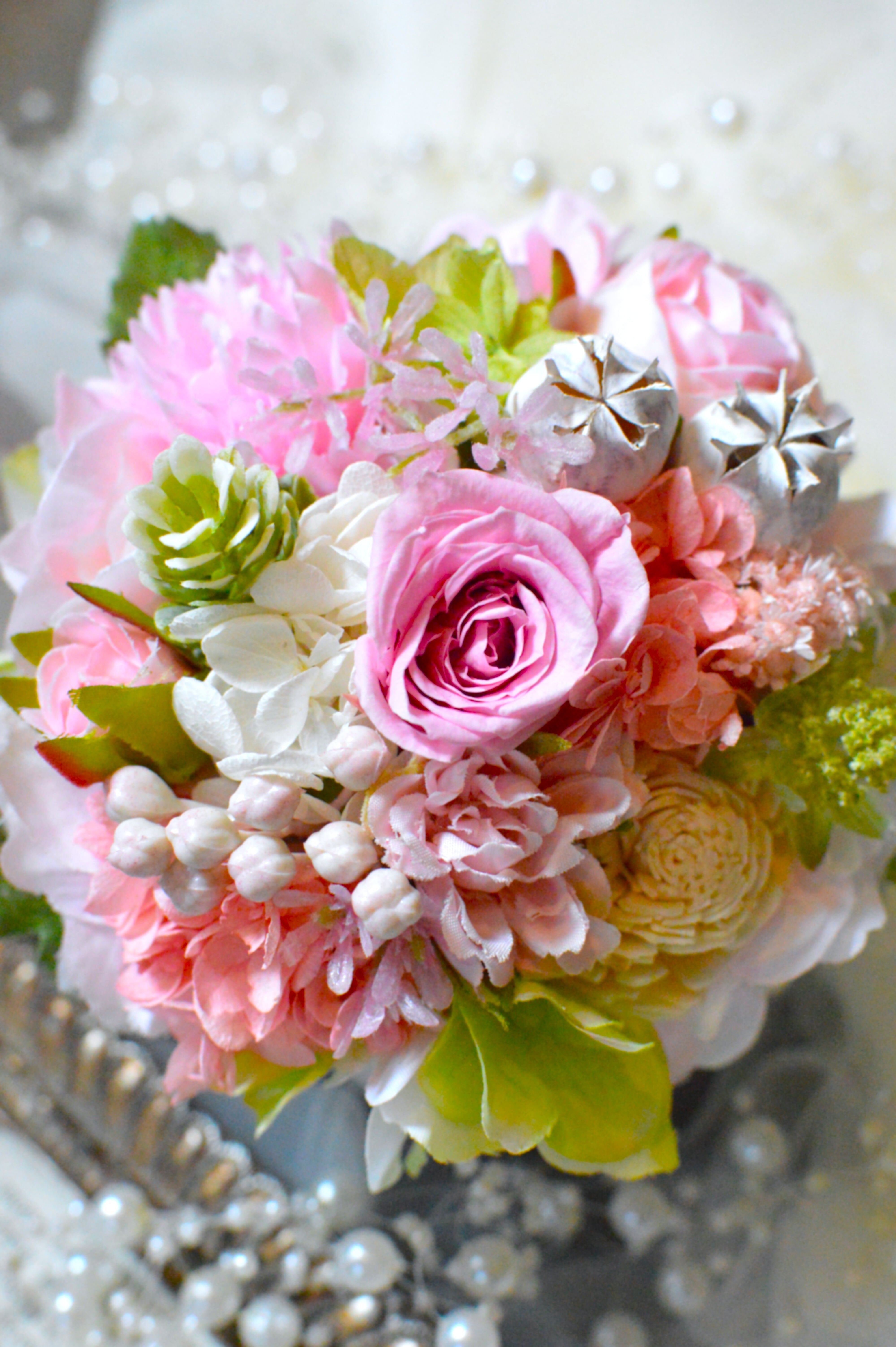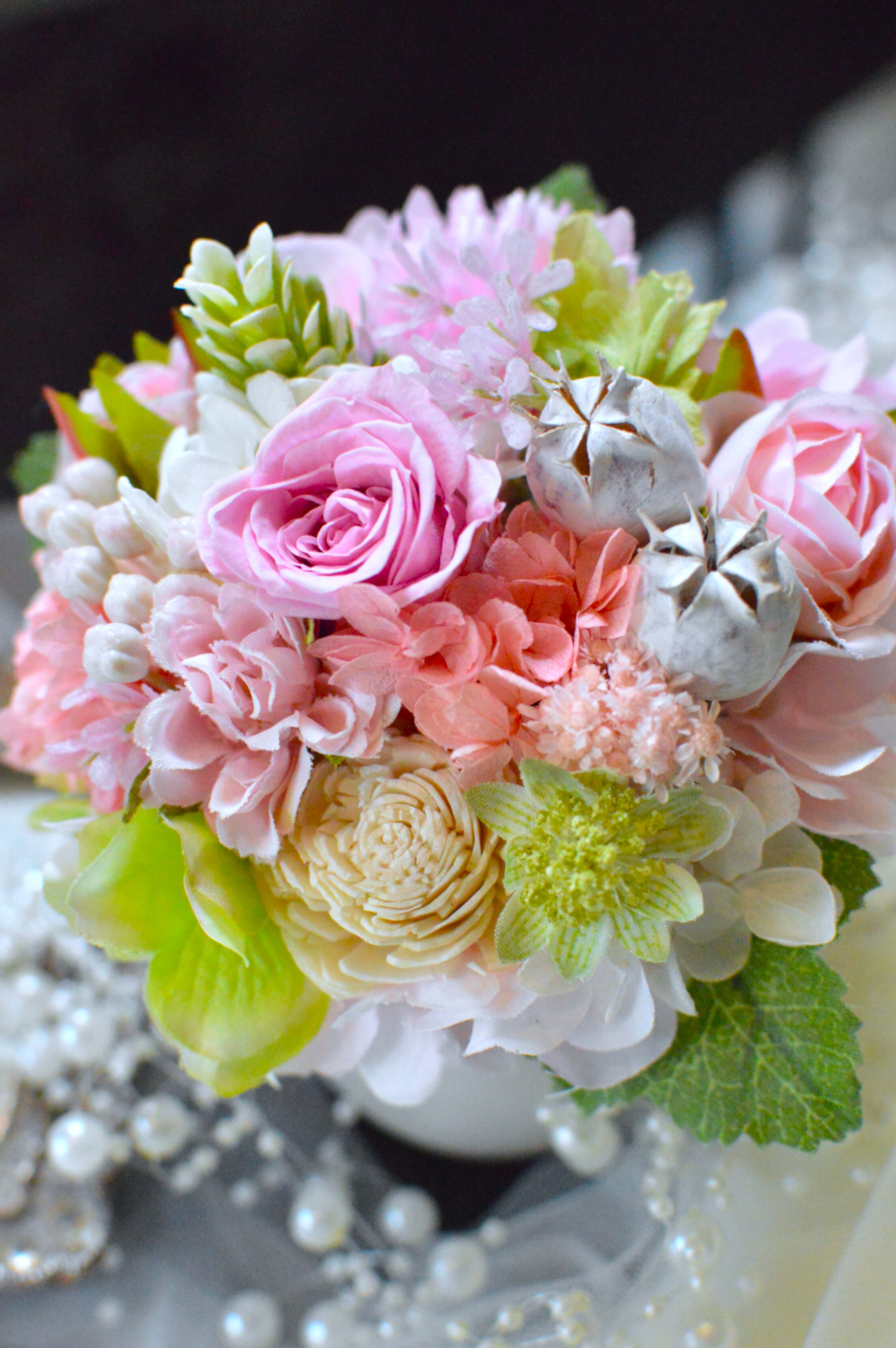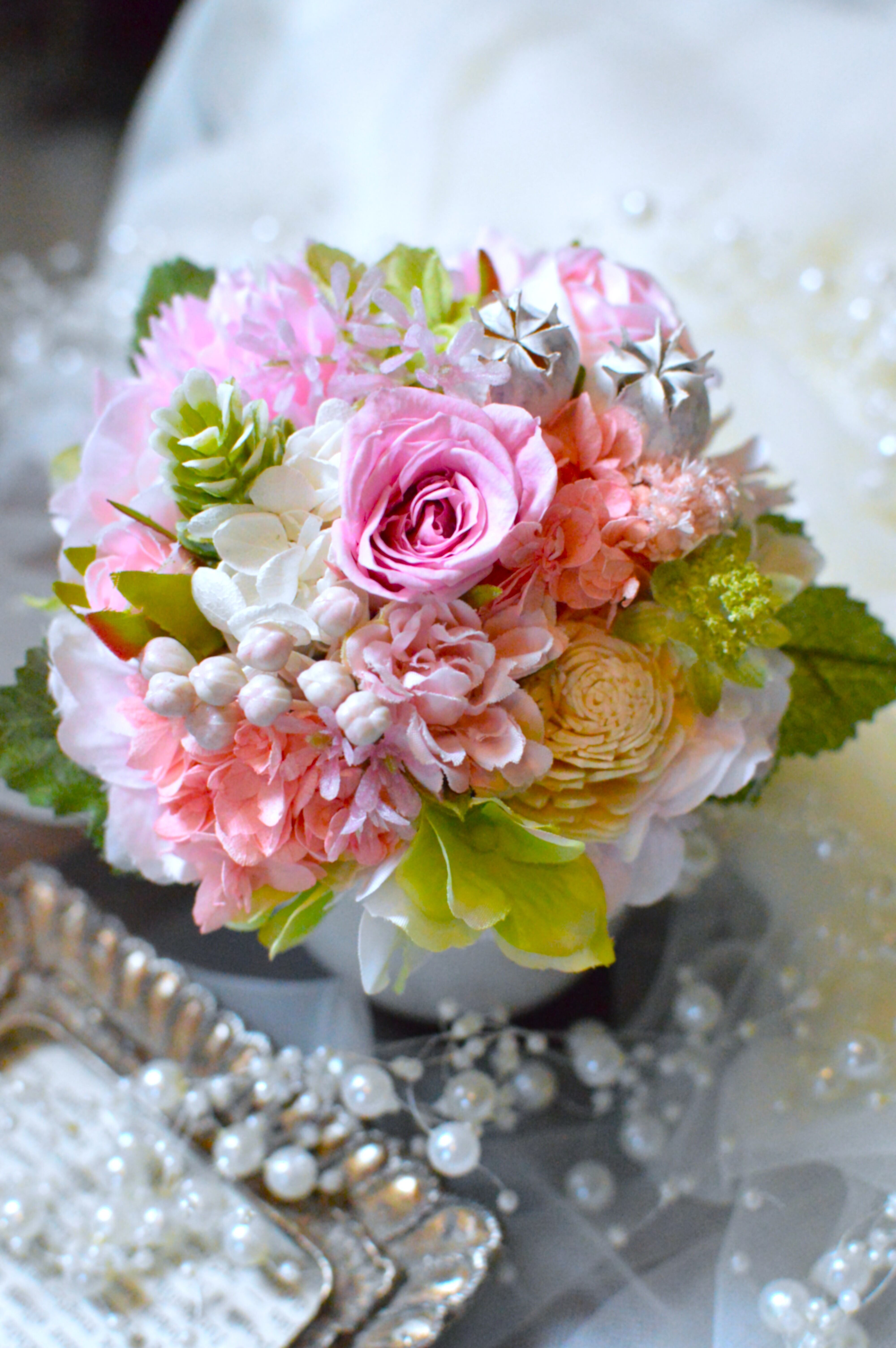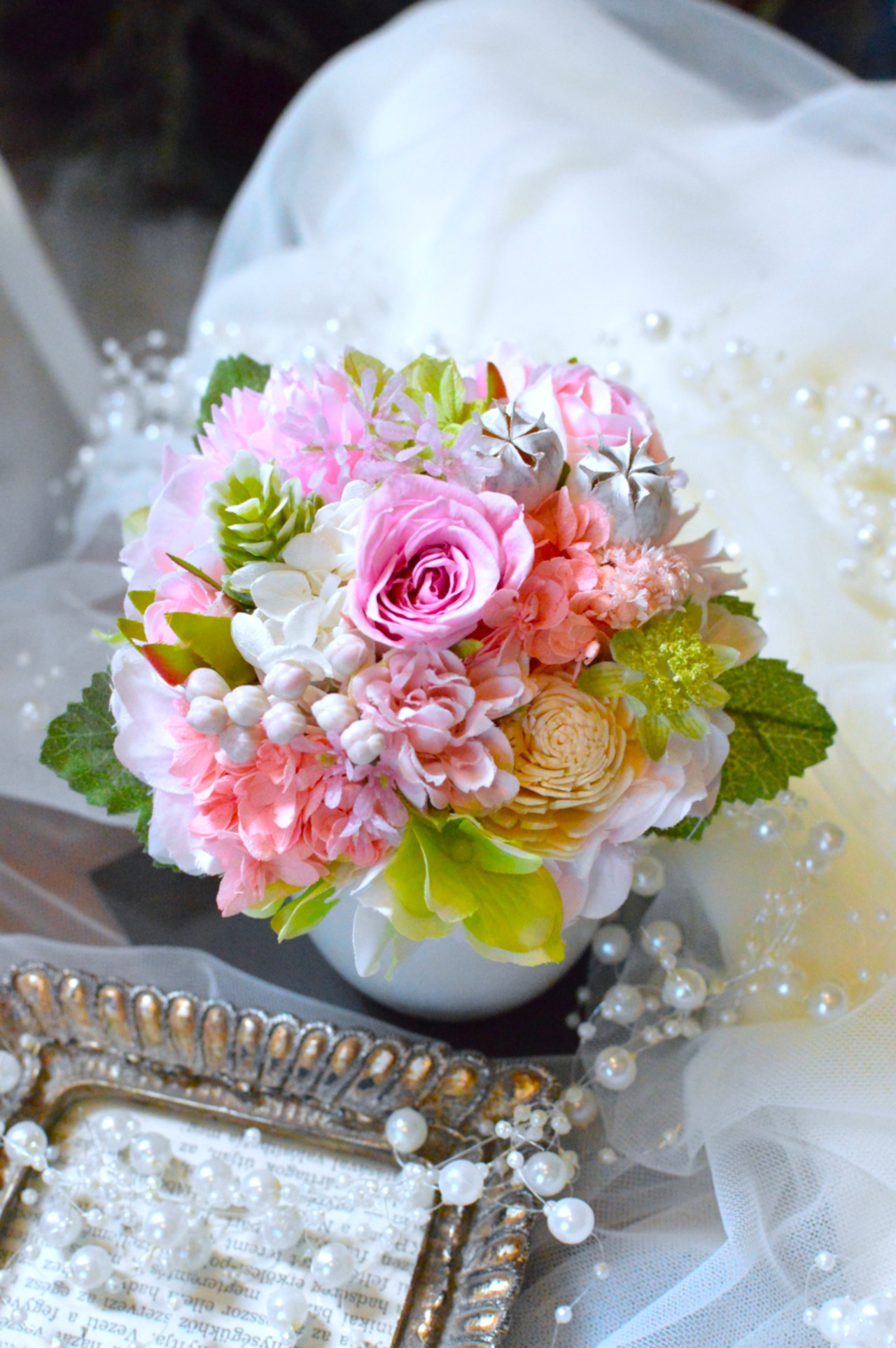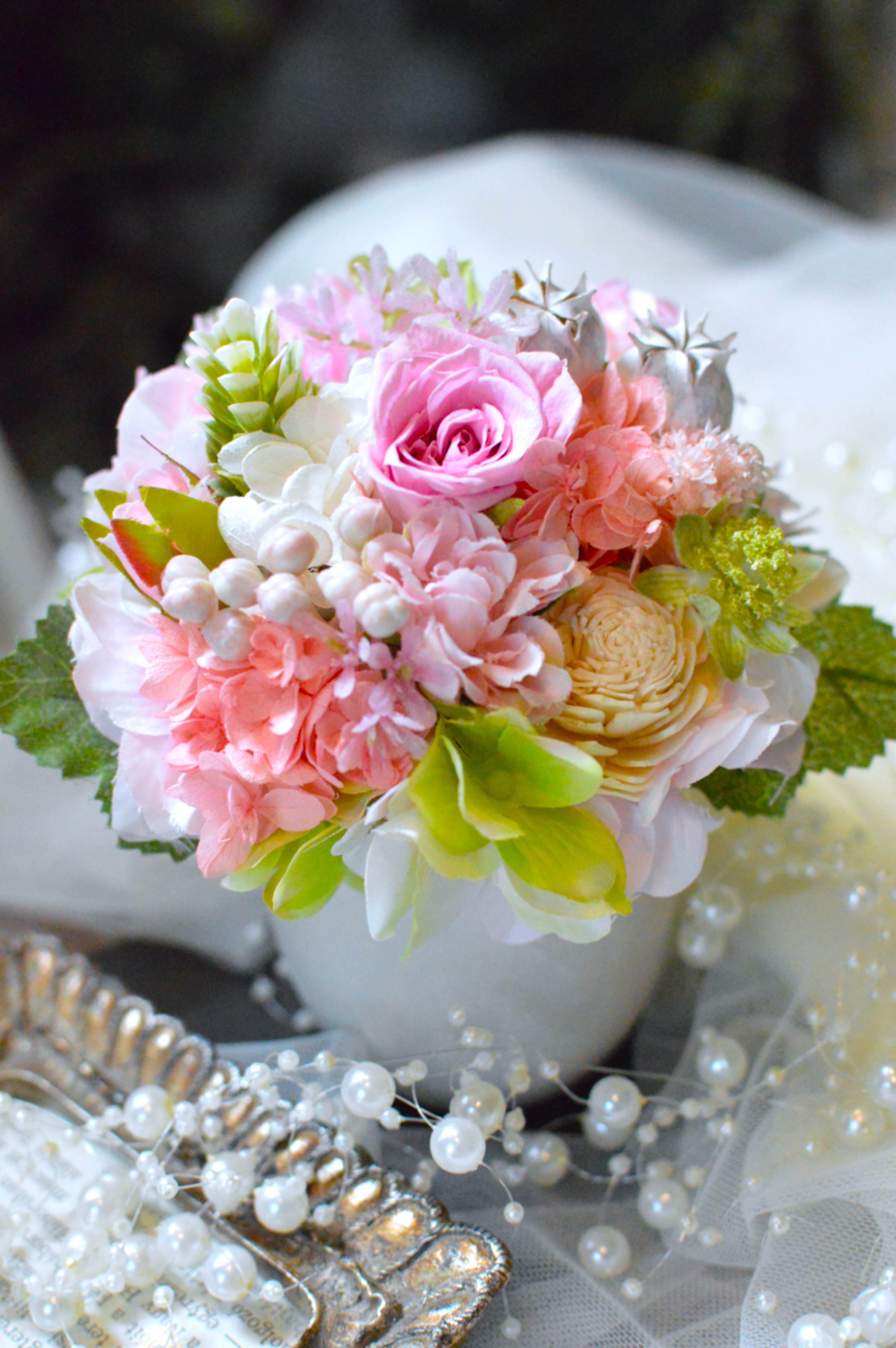 プリザーブドフラワー×アーティフィシャルフラワー×ドライフラワーを使用し、それぞれの素材の良さを組み合わせたハイブリッドフラワーアレンジメント。