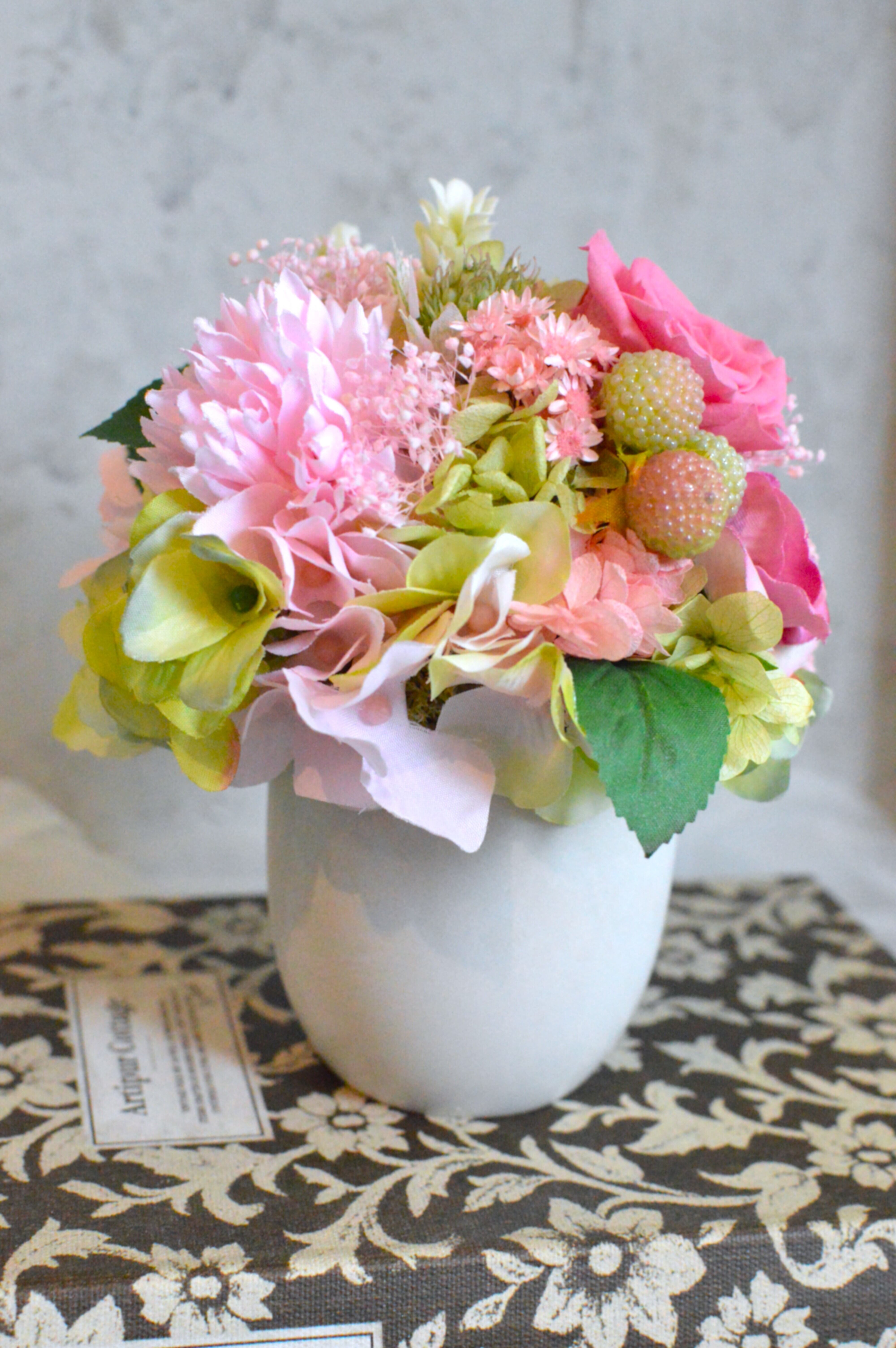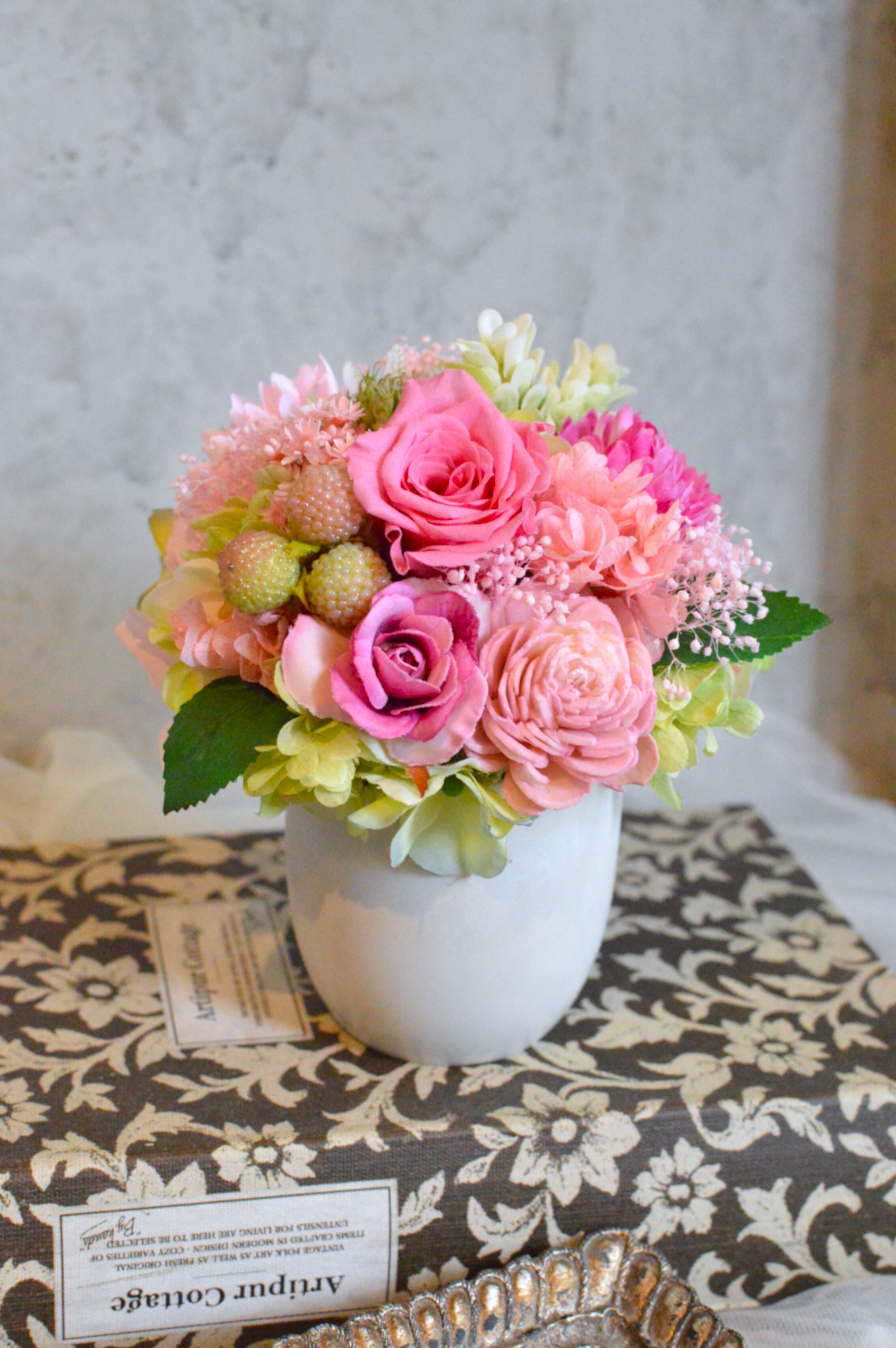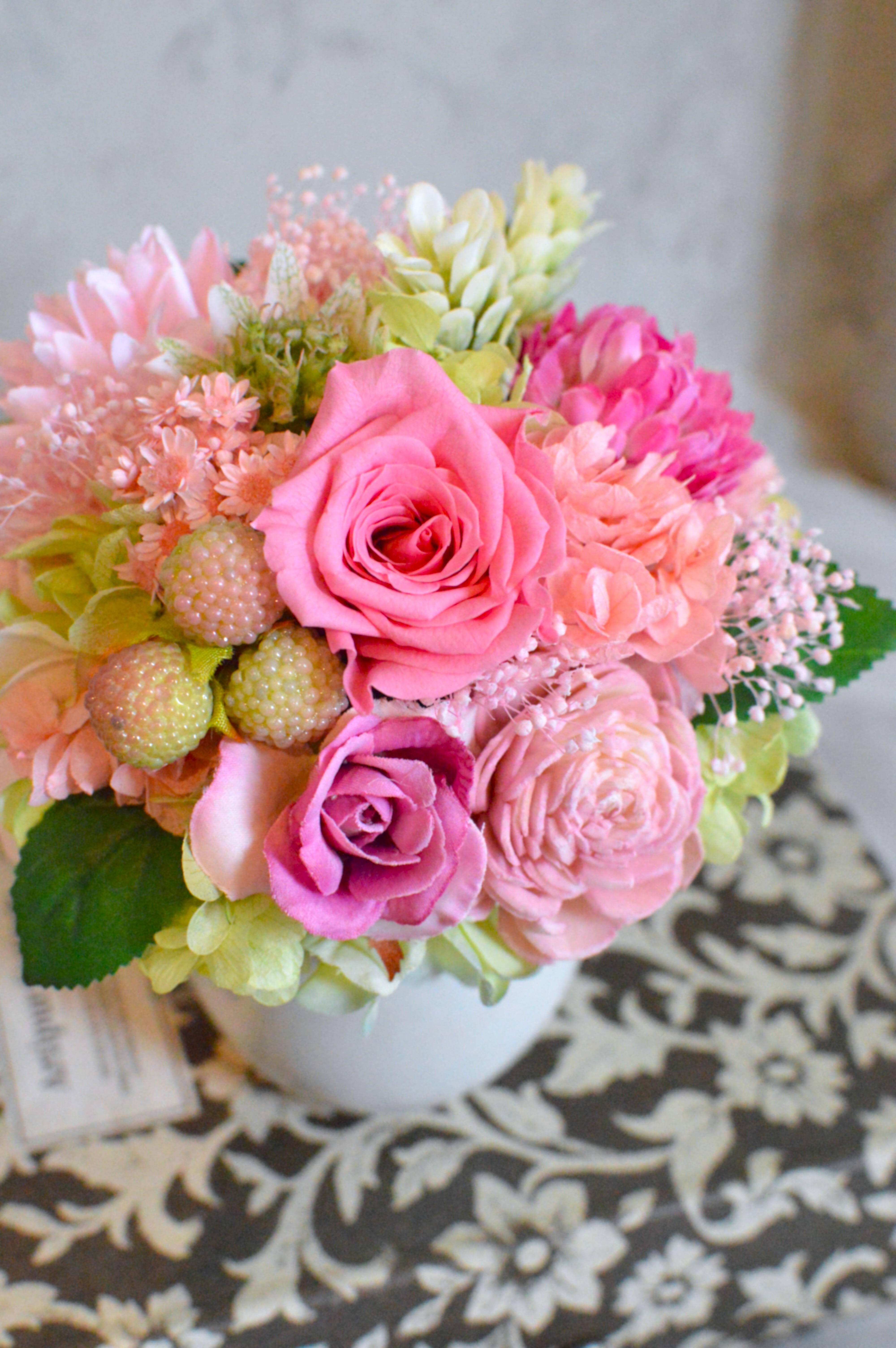プリザーブドフラワーやアーティフィシャルフラワー、ドライフラワーを使用し、お水不要で長い間美しさを楽しむ事が出来ます。