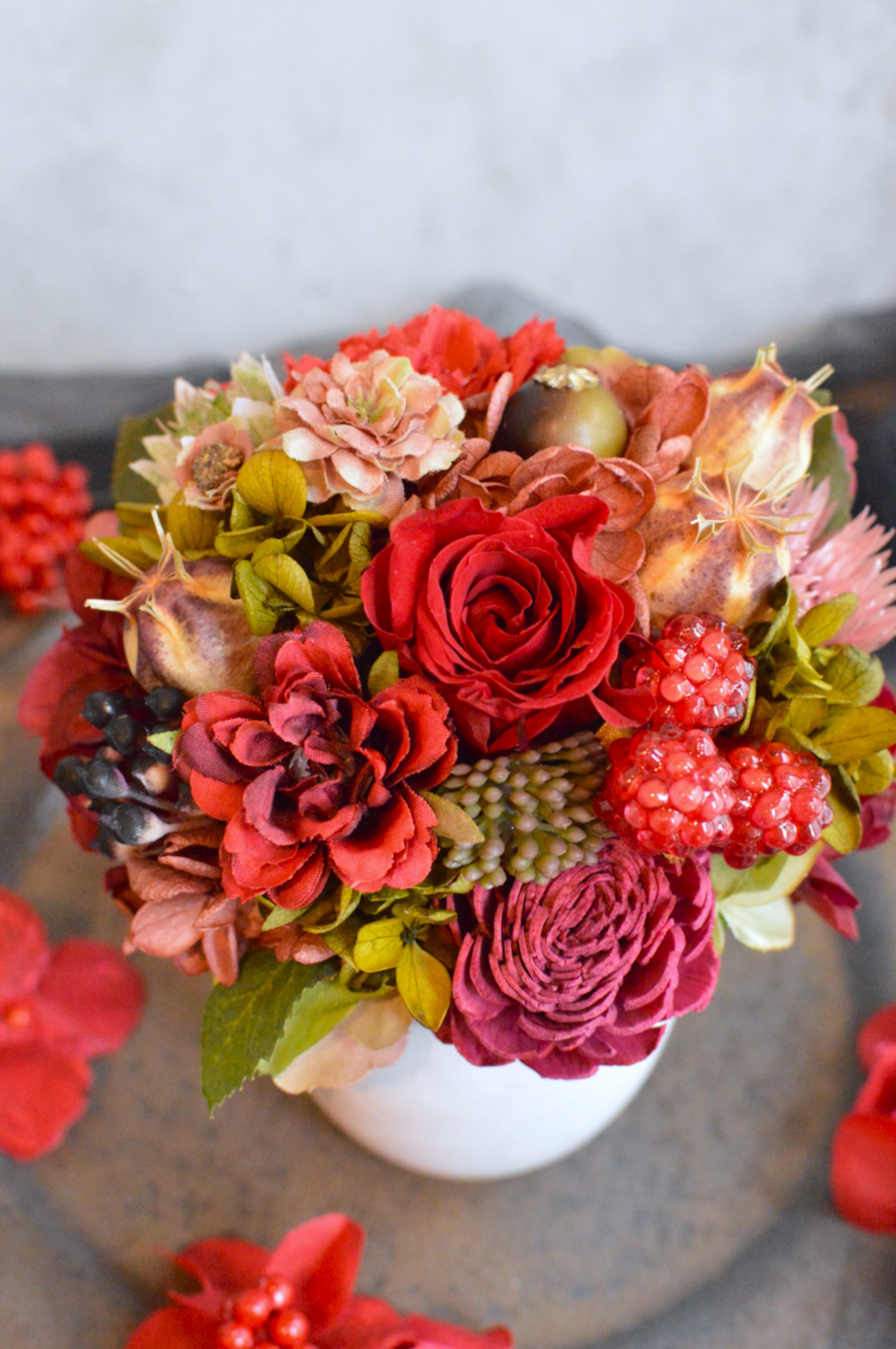 シックな雰囲気を演出するアンティークレッドミニアレンジメント(Sサイズ)。