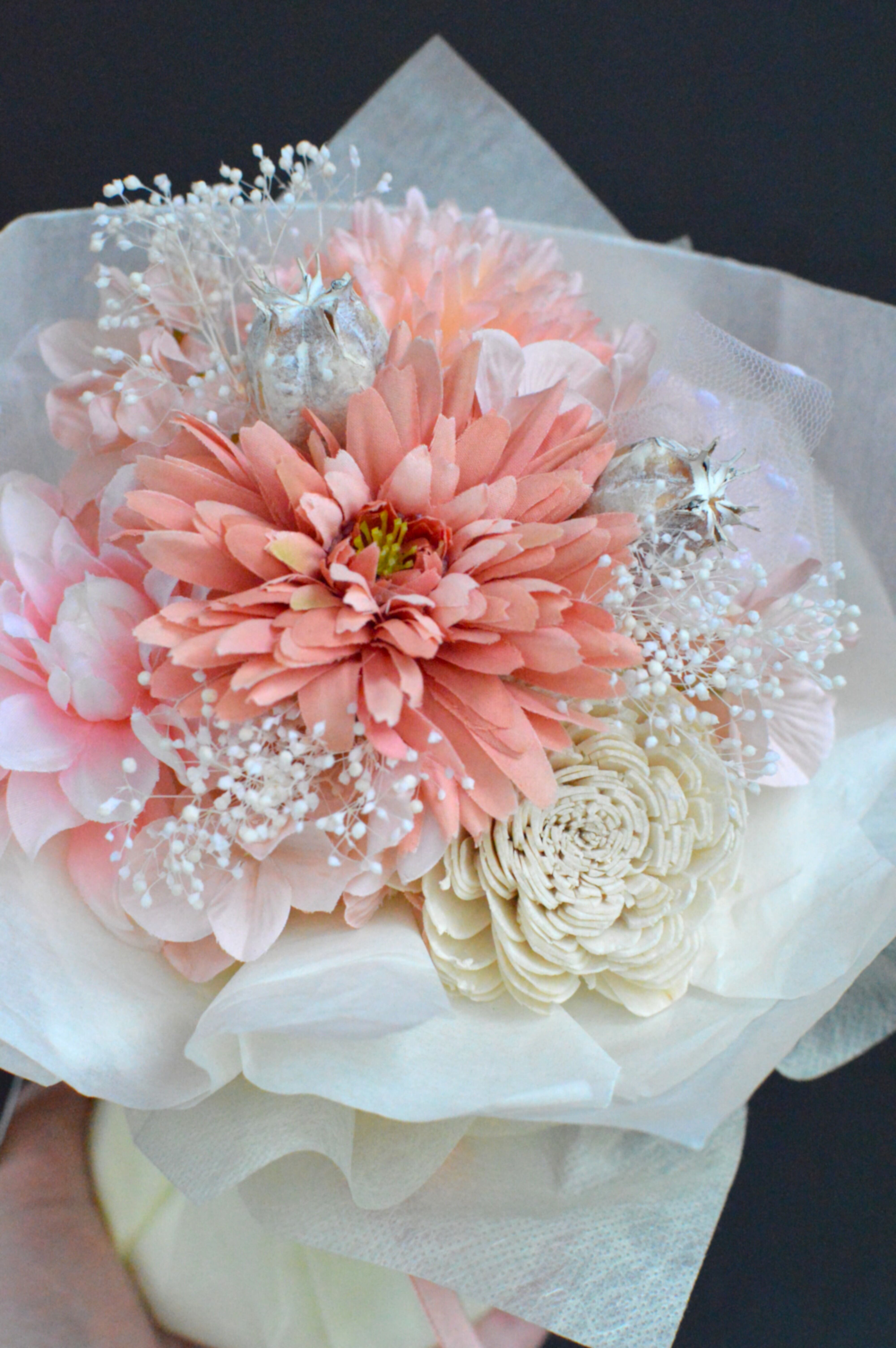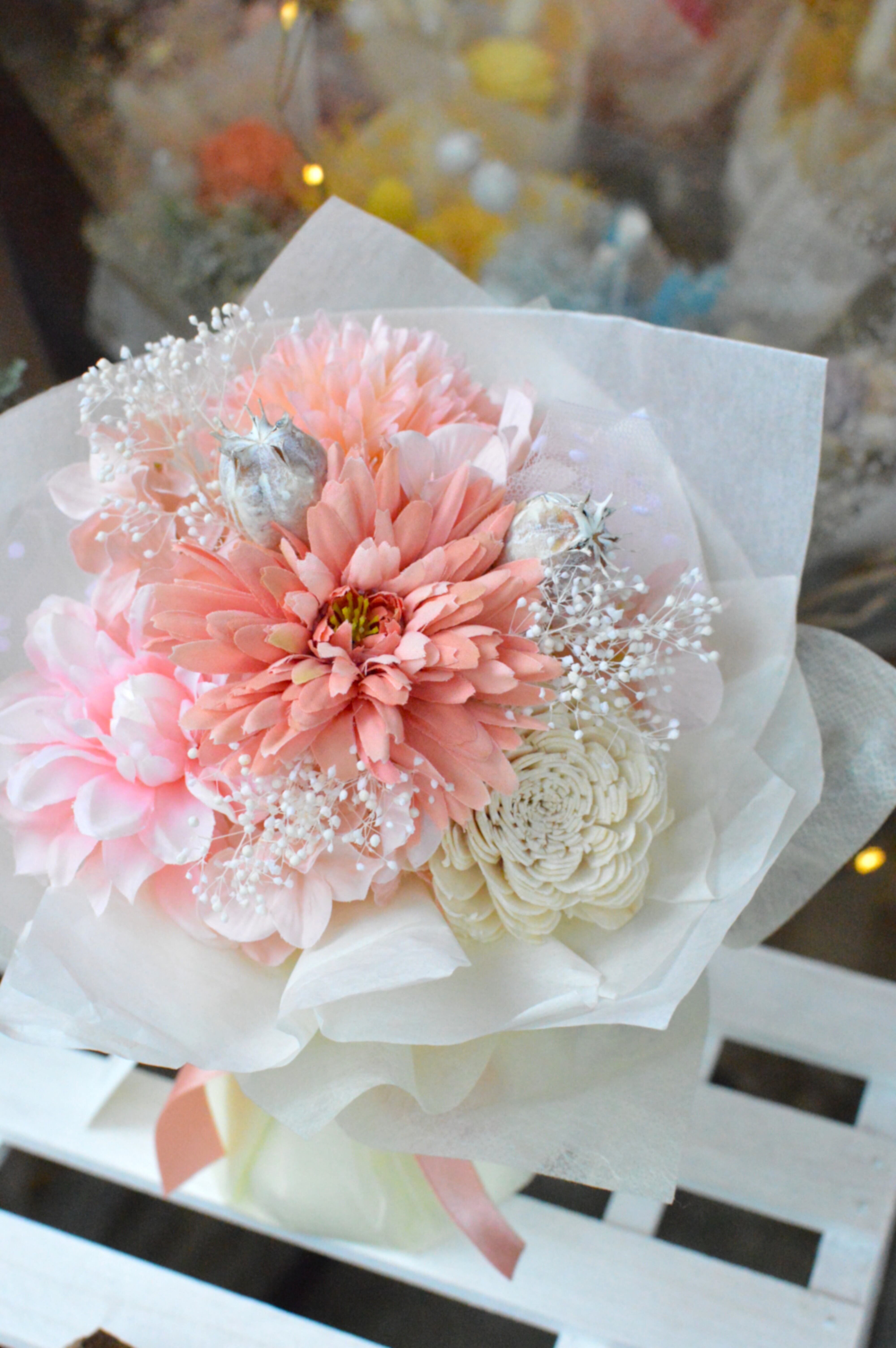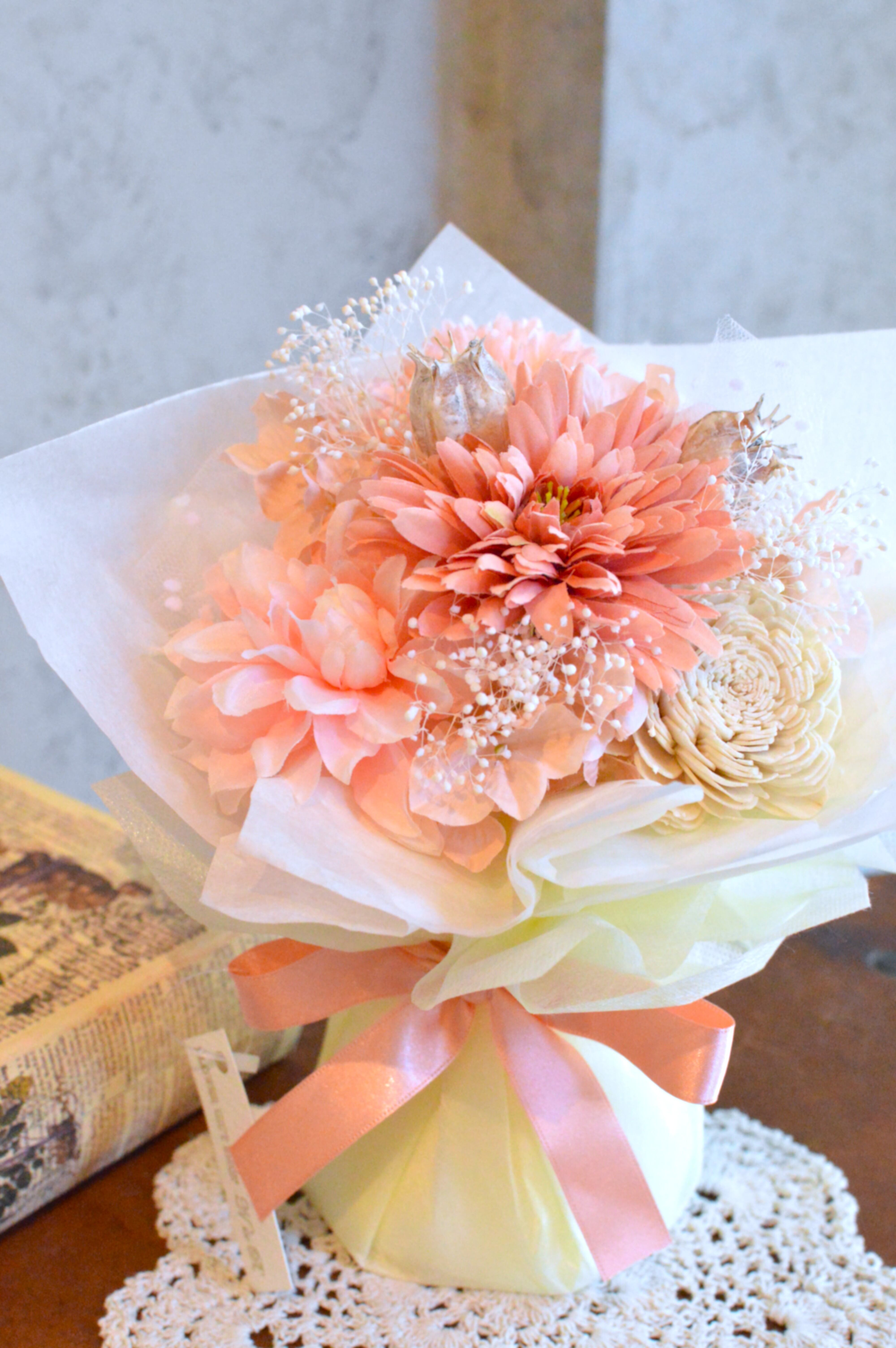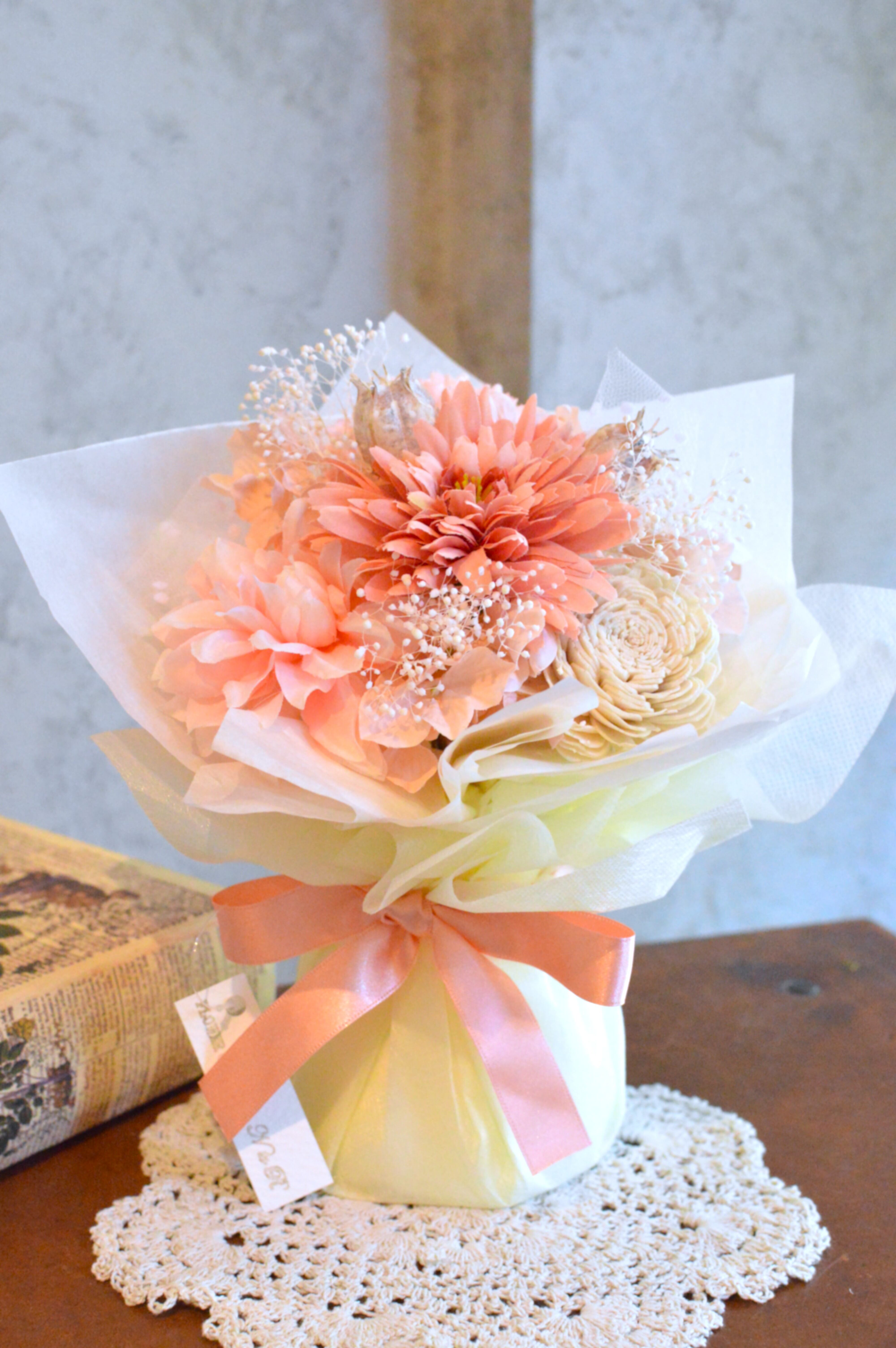 アーティフィシャルフラワーとドライフラワーを使用した置き型ブーケ。