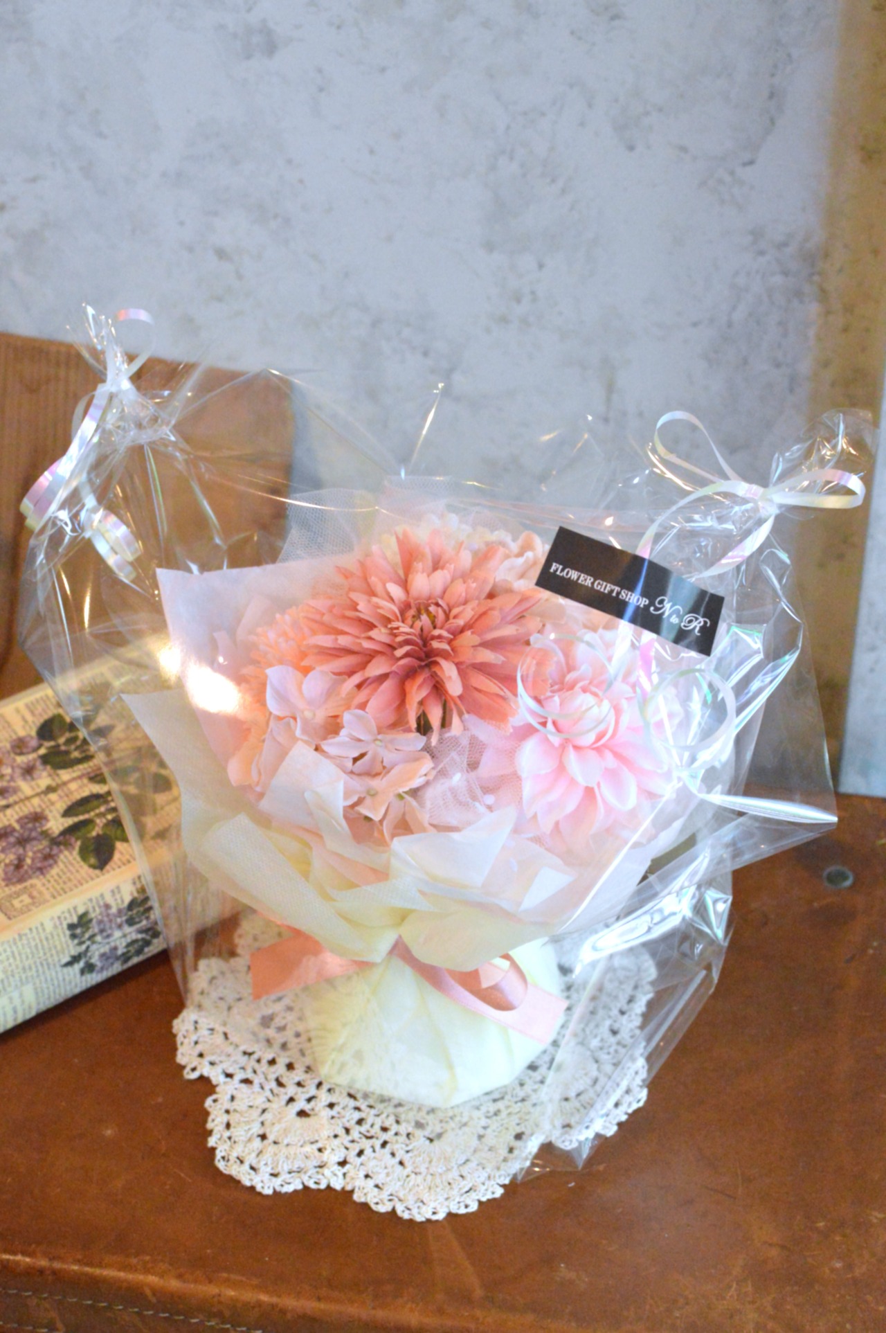 ピーチピンクのマムをメインに、アイボリーやピンク等の同系色でまとめました。淡いピンクのドット柄チュールを合わせて可愛らしさもプラスされています。