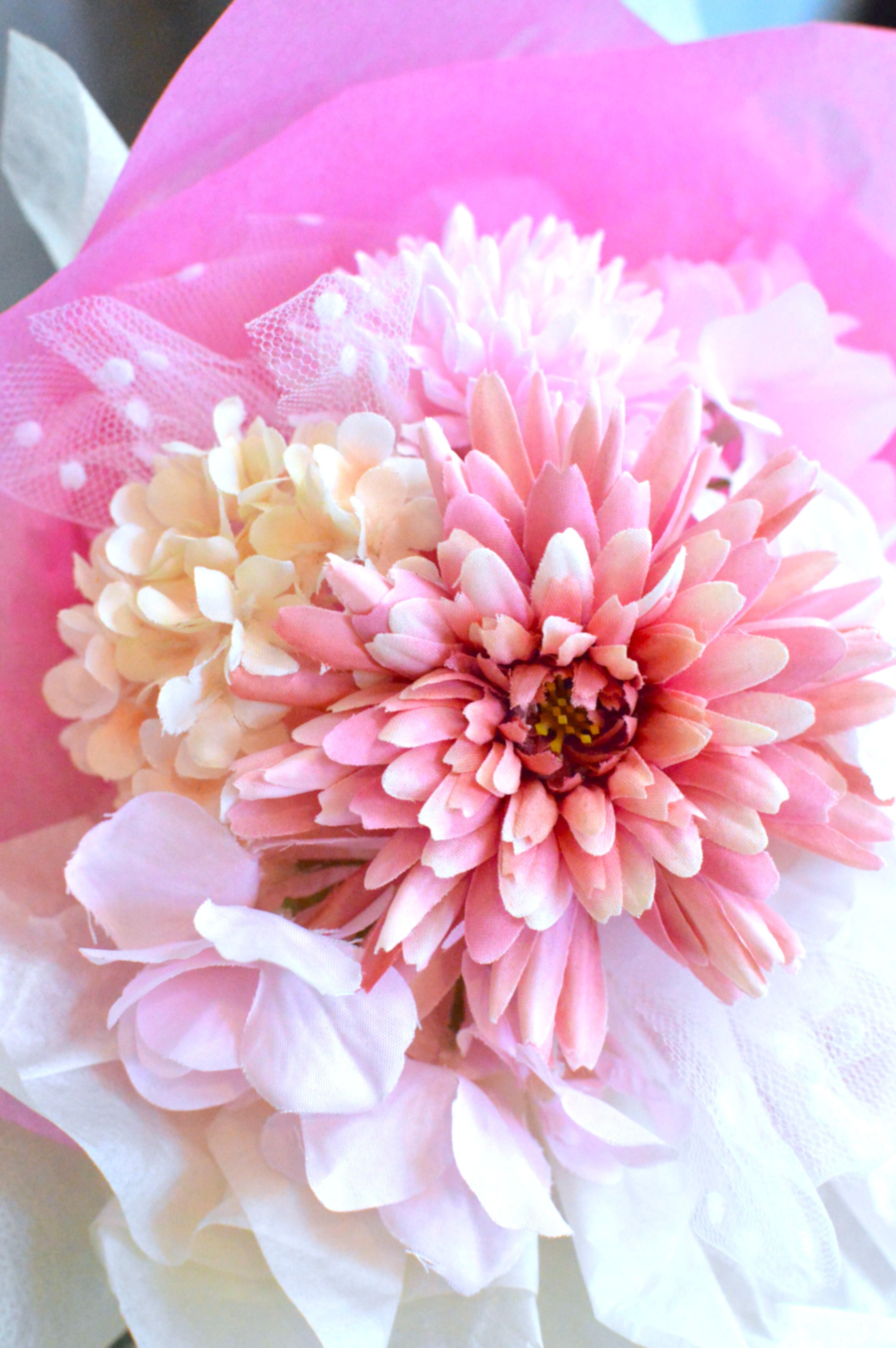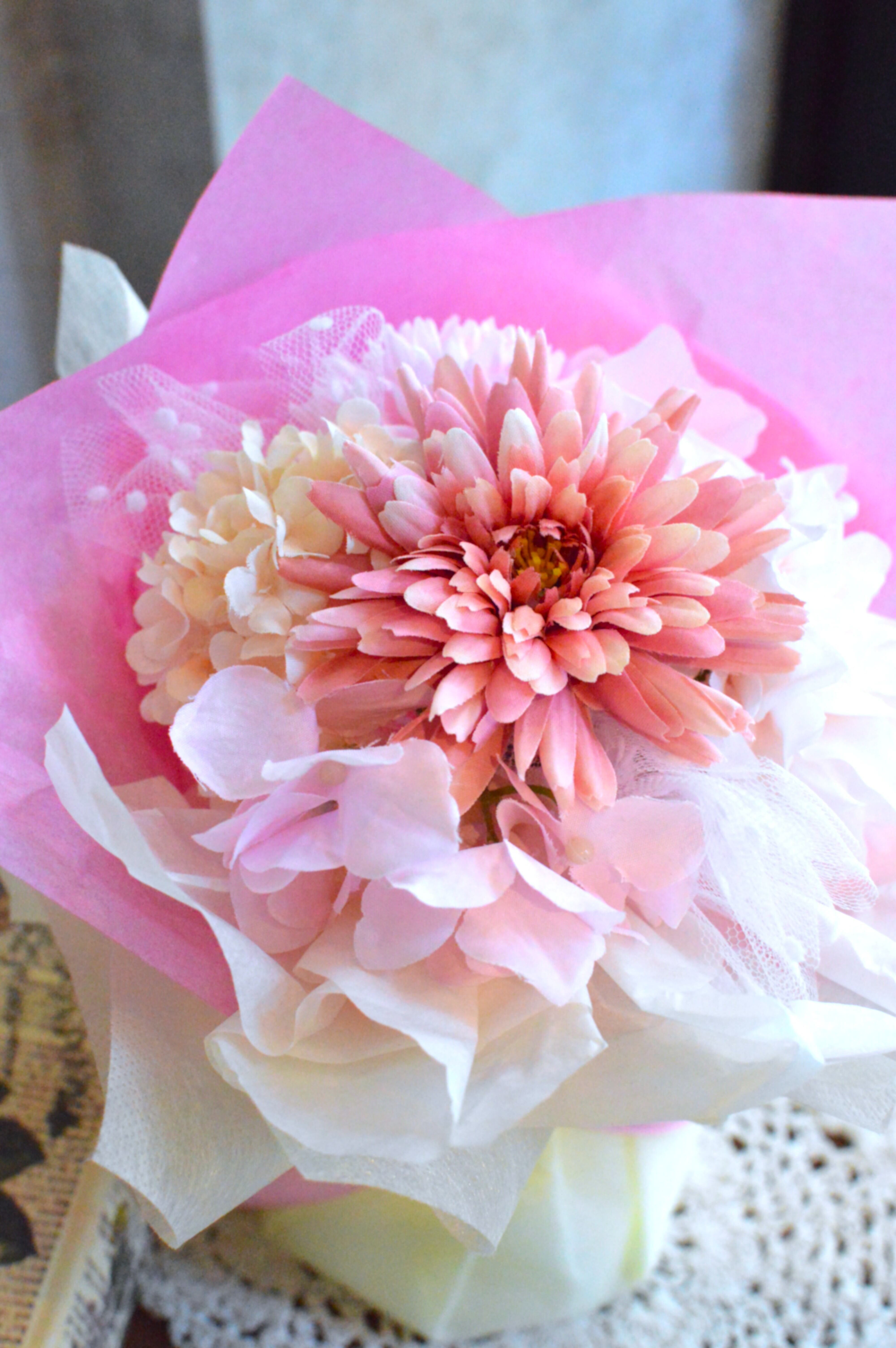 ピンクのマムをメインに、アイボリーやピンク等の同系色でまとめました。淡いピンクのドット柄チュールを合わせて可愛らしさもプラスされています。