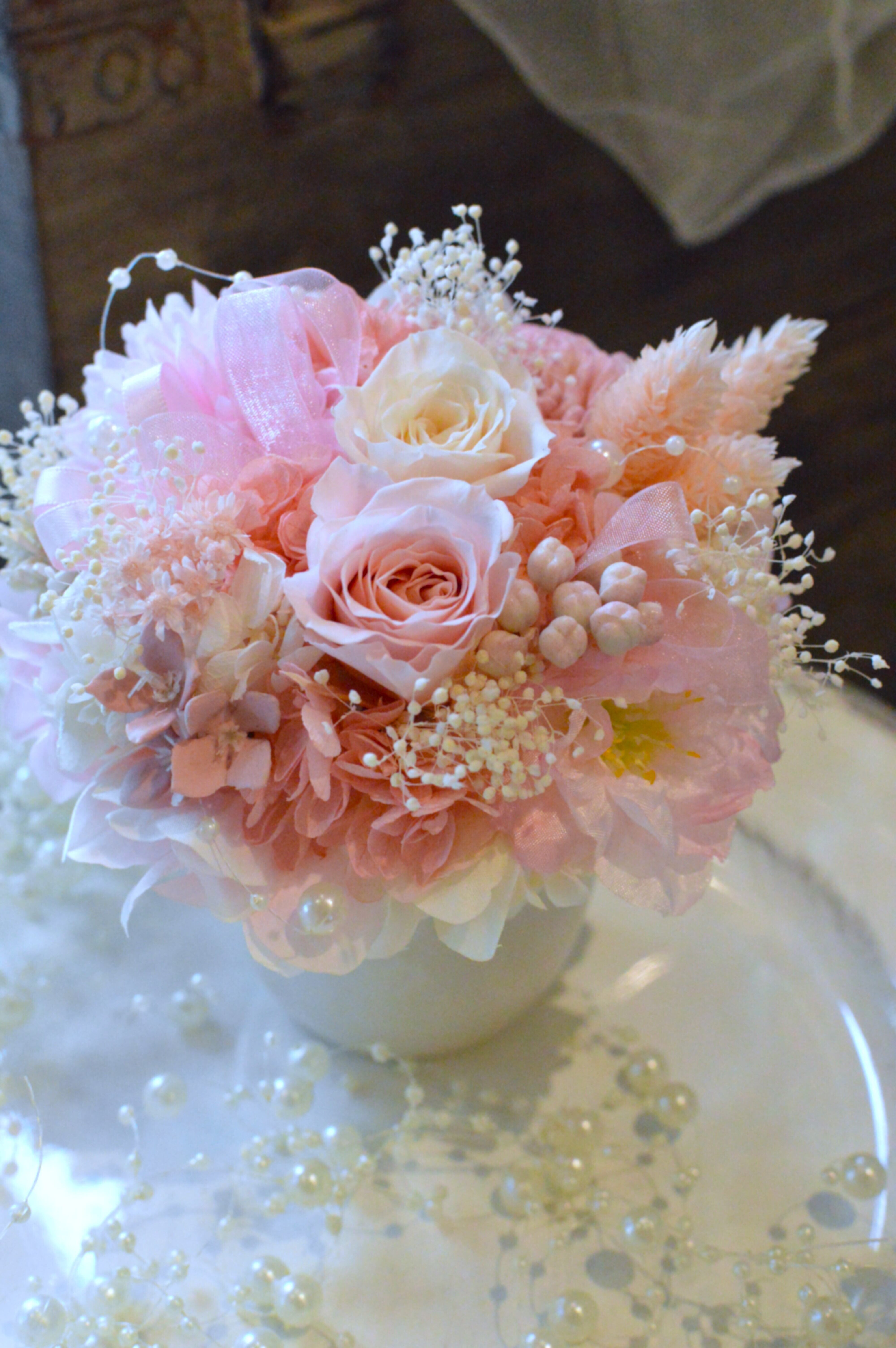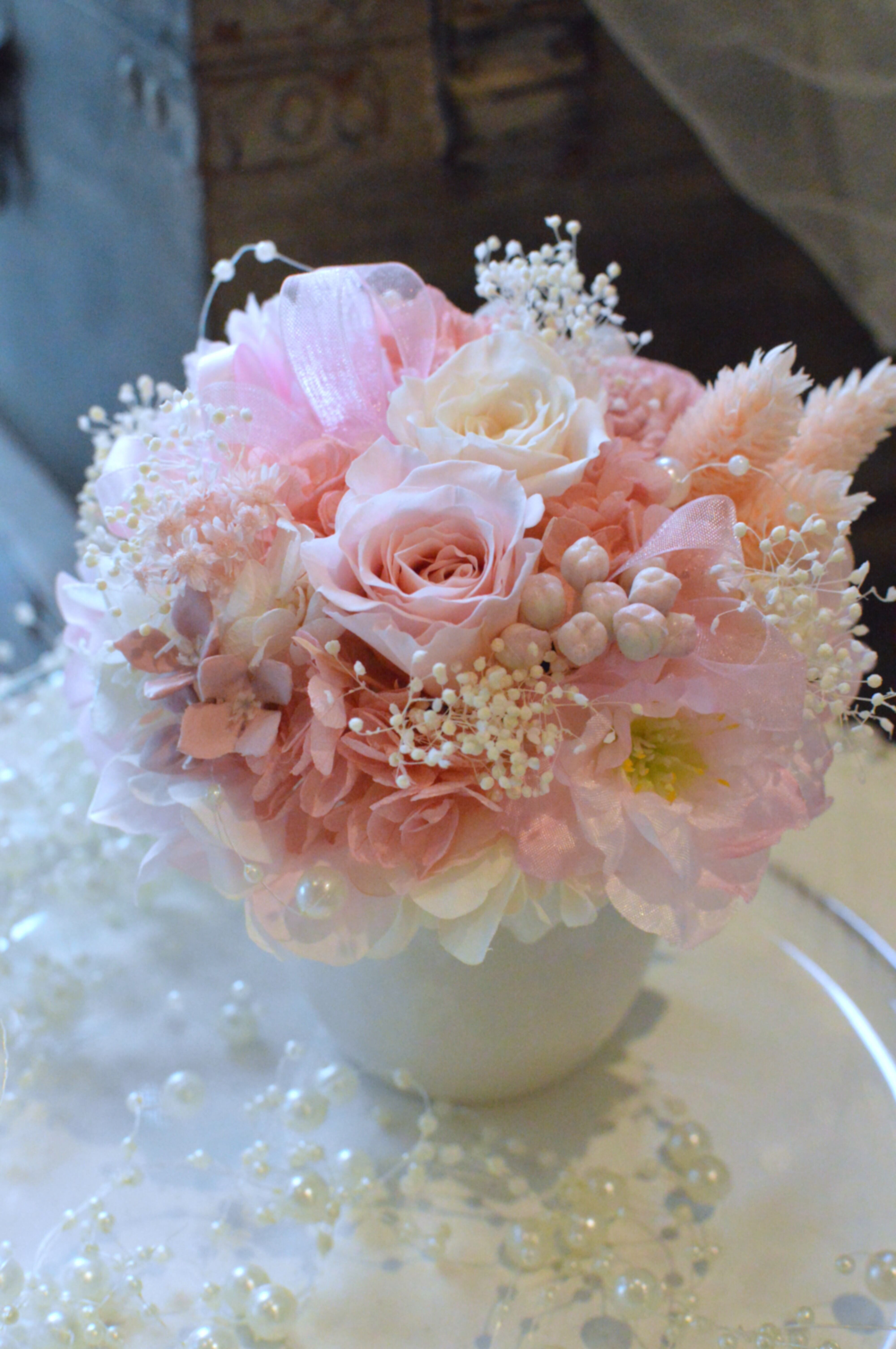 プリザーブドフラワーやアーティフィシャルフラワー、ドライフラワーを使用し、お水不要で長い間美しさを楽しむ事が出来ます。