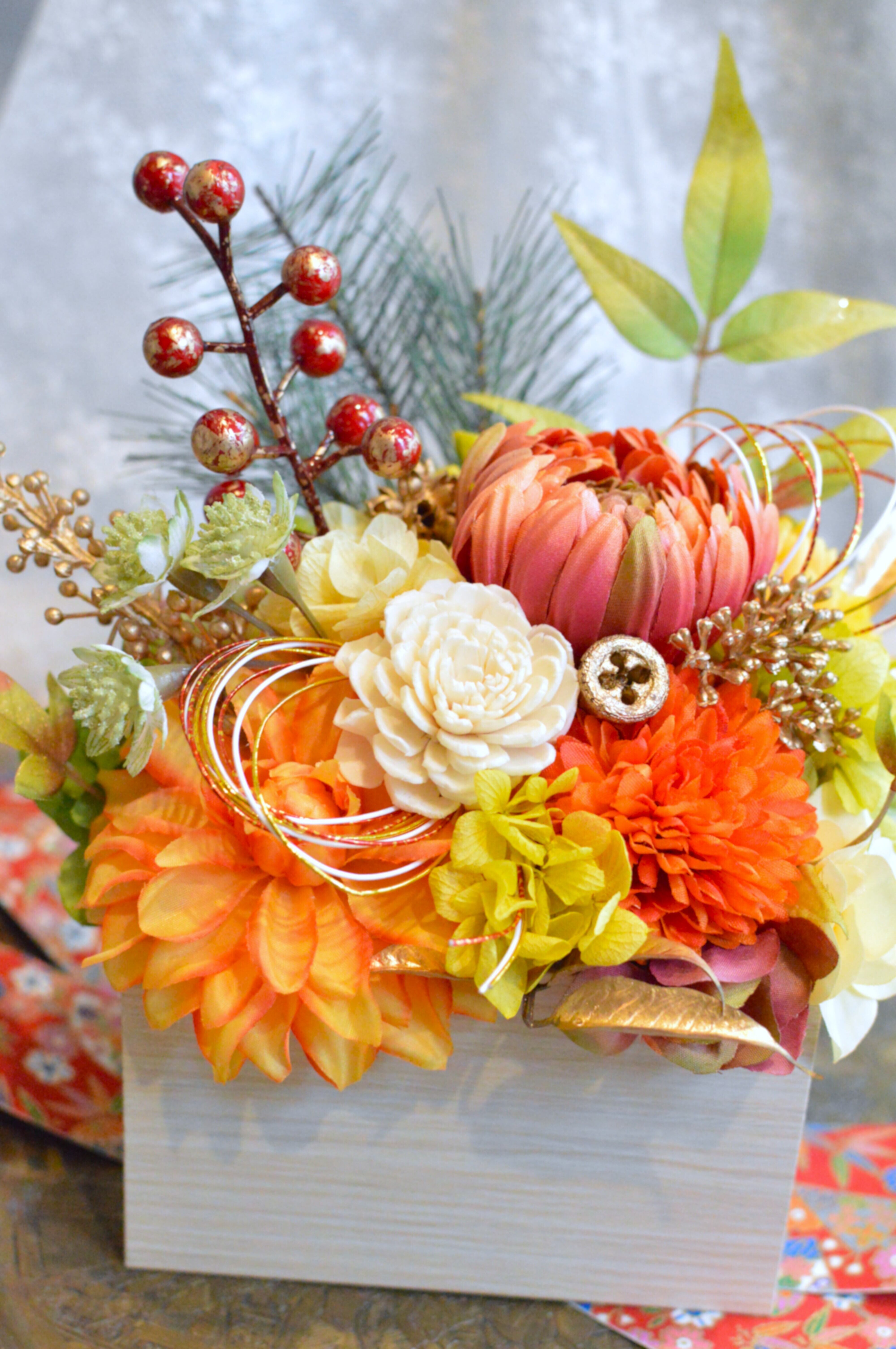 アーティフィシャルフラワーをメインにプリザーブドフラワー、ドライフラワーを使用したお正月アレンジメント。