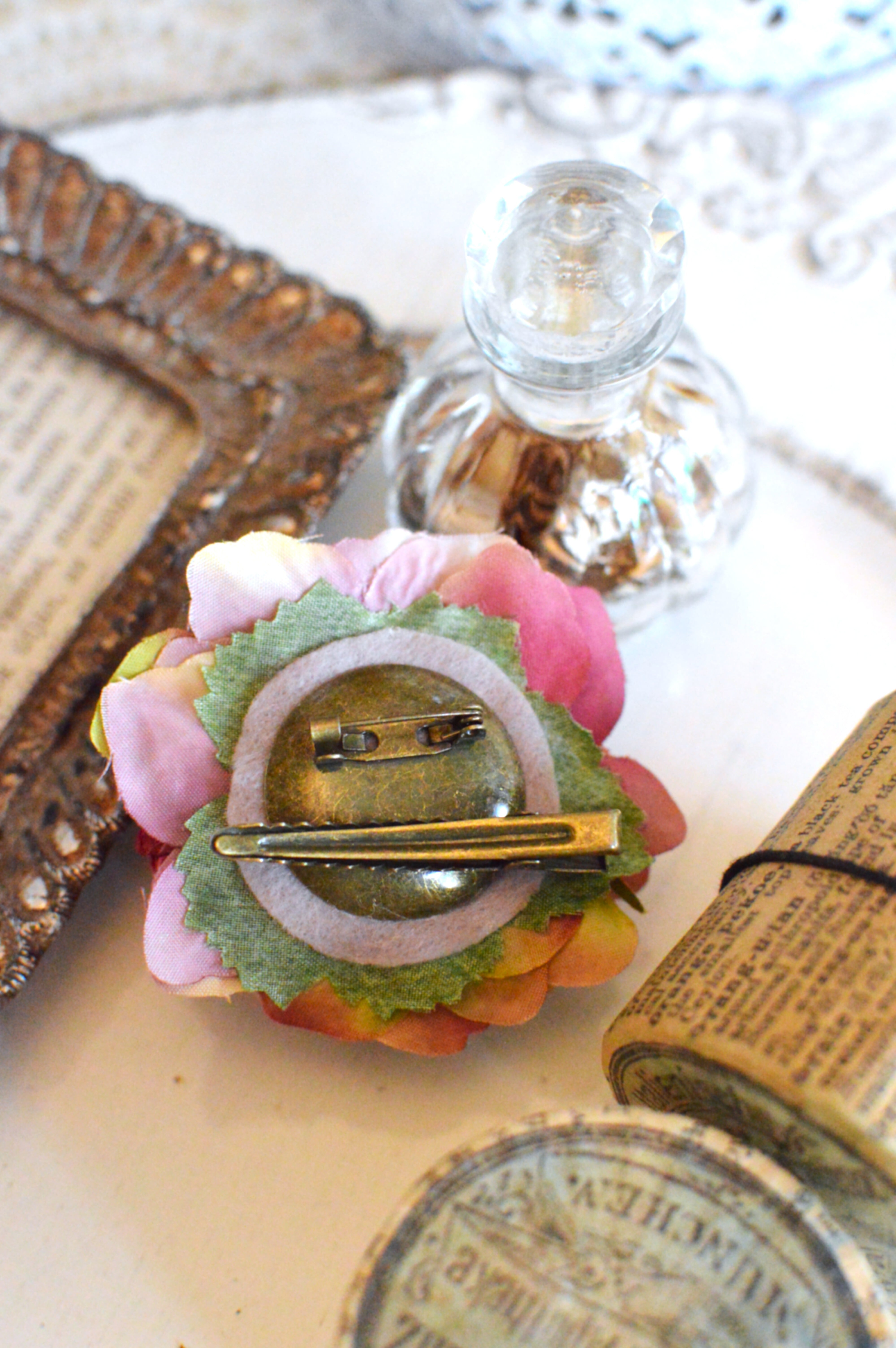 止め金具は真鍮色でピンとクリップの2wayタイプ。
