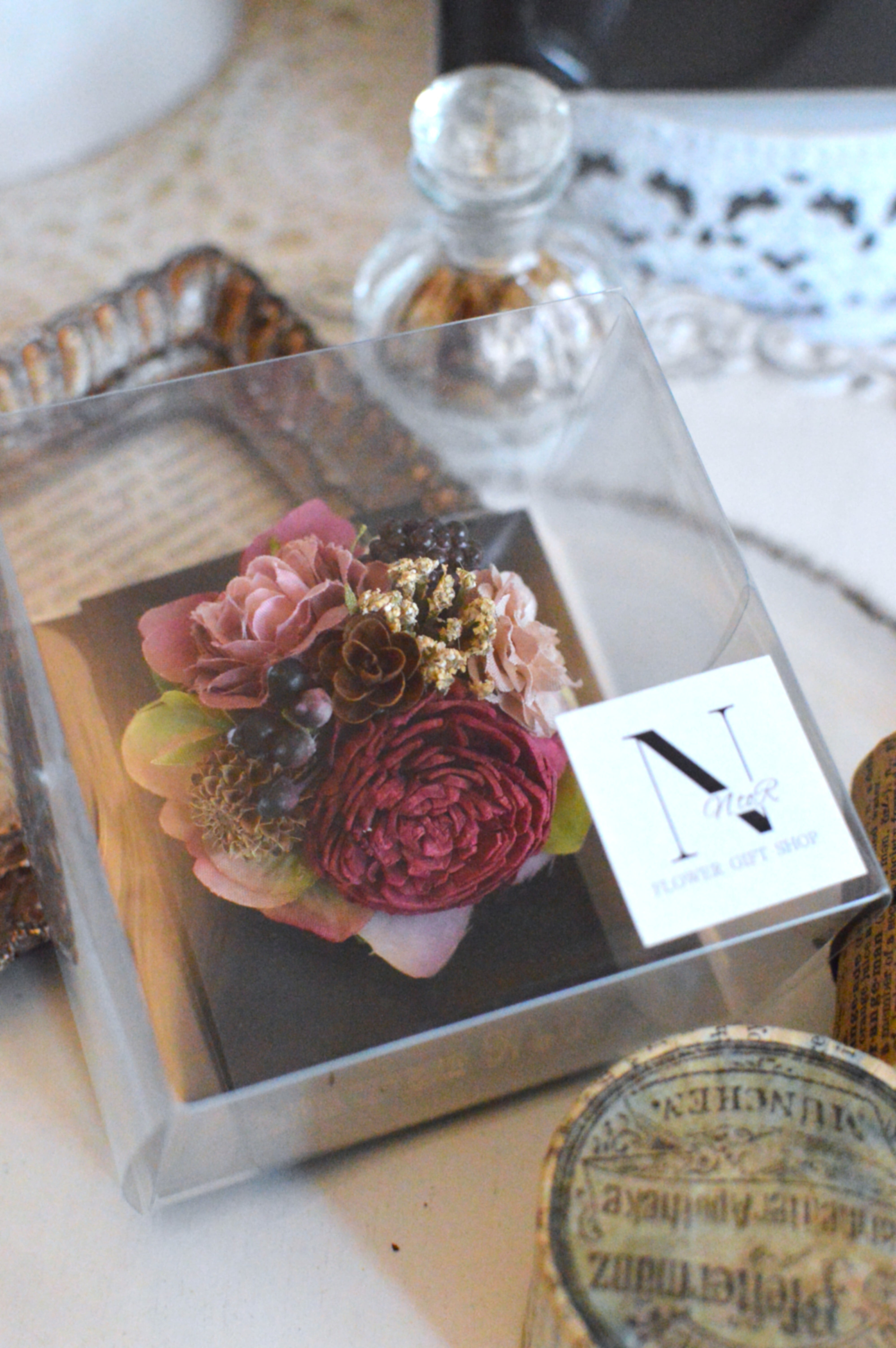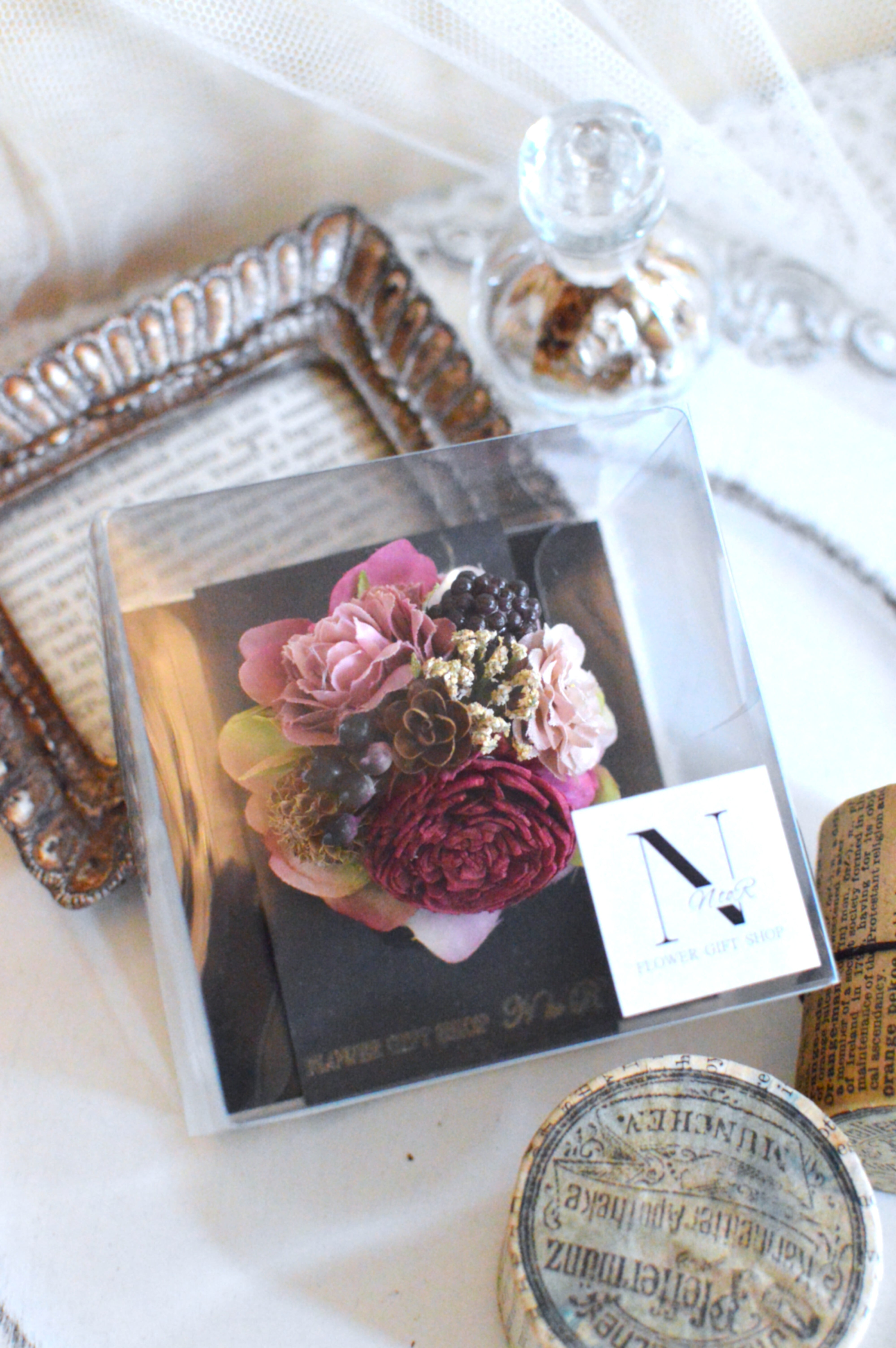 ワインレッドのお花をメインに全体を渋めカラーでまとめました。黒いべりーがより引き締めてくれて大人っぽい仕上がりとなっております。
