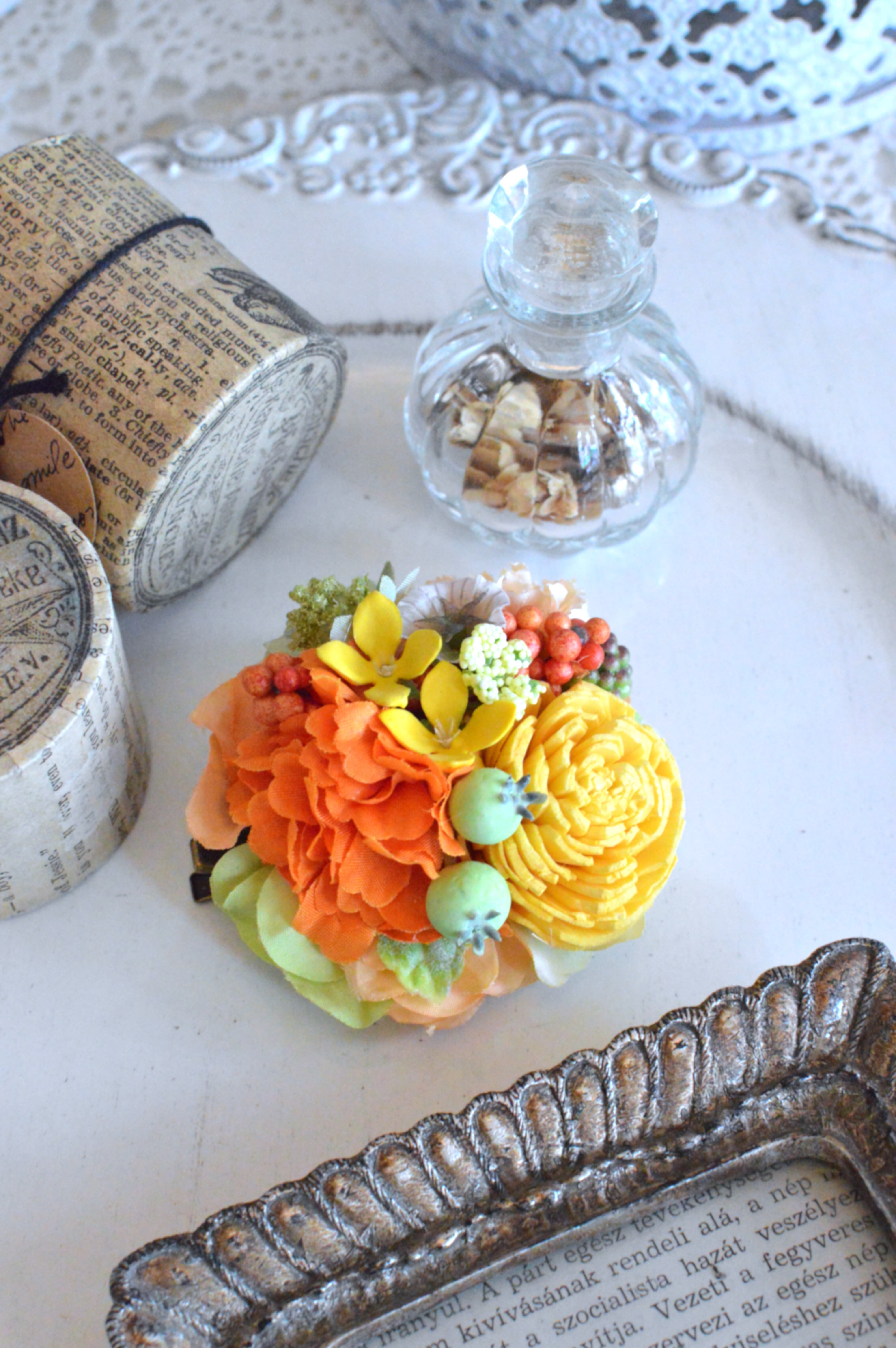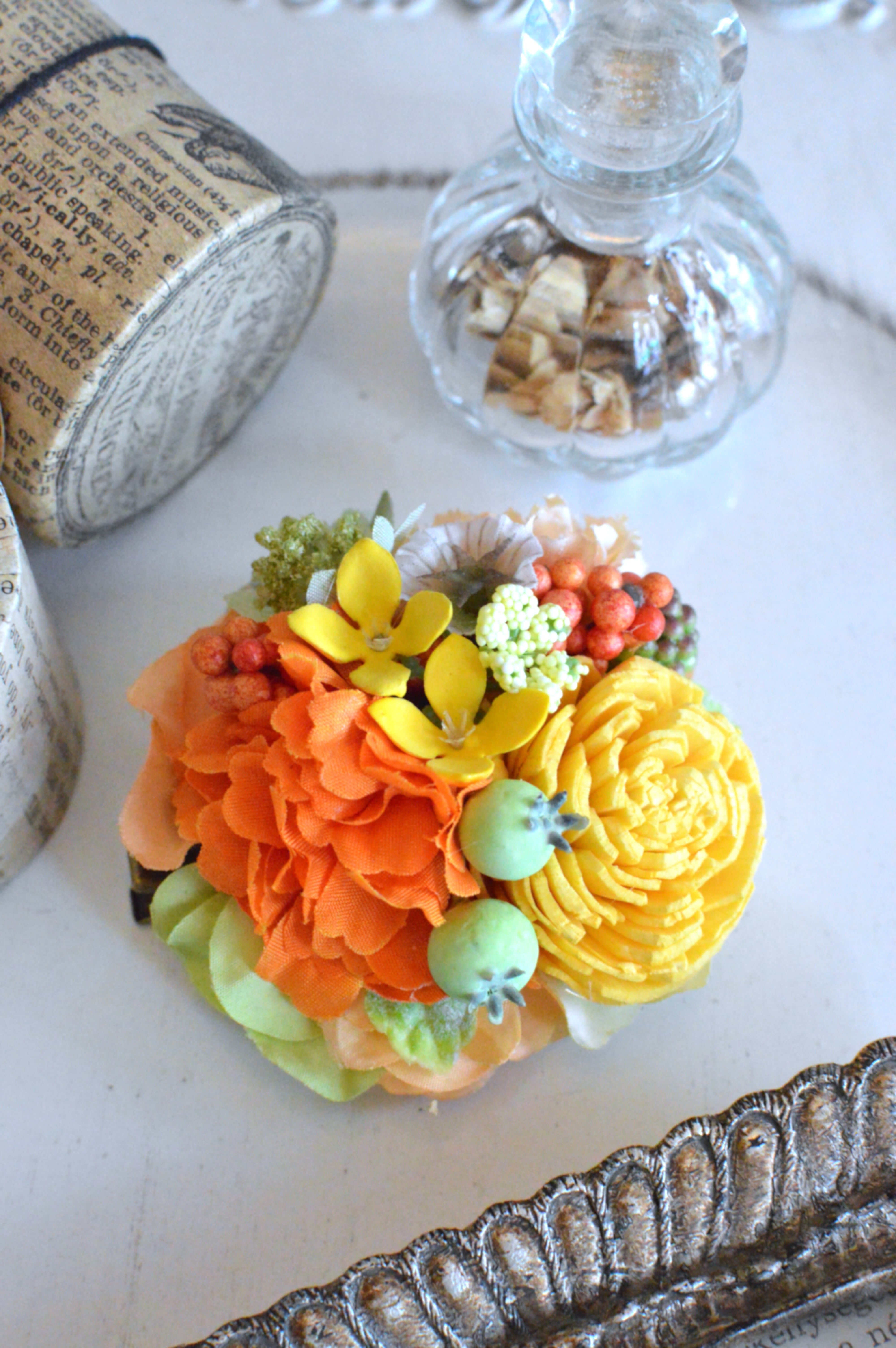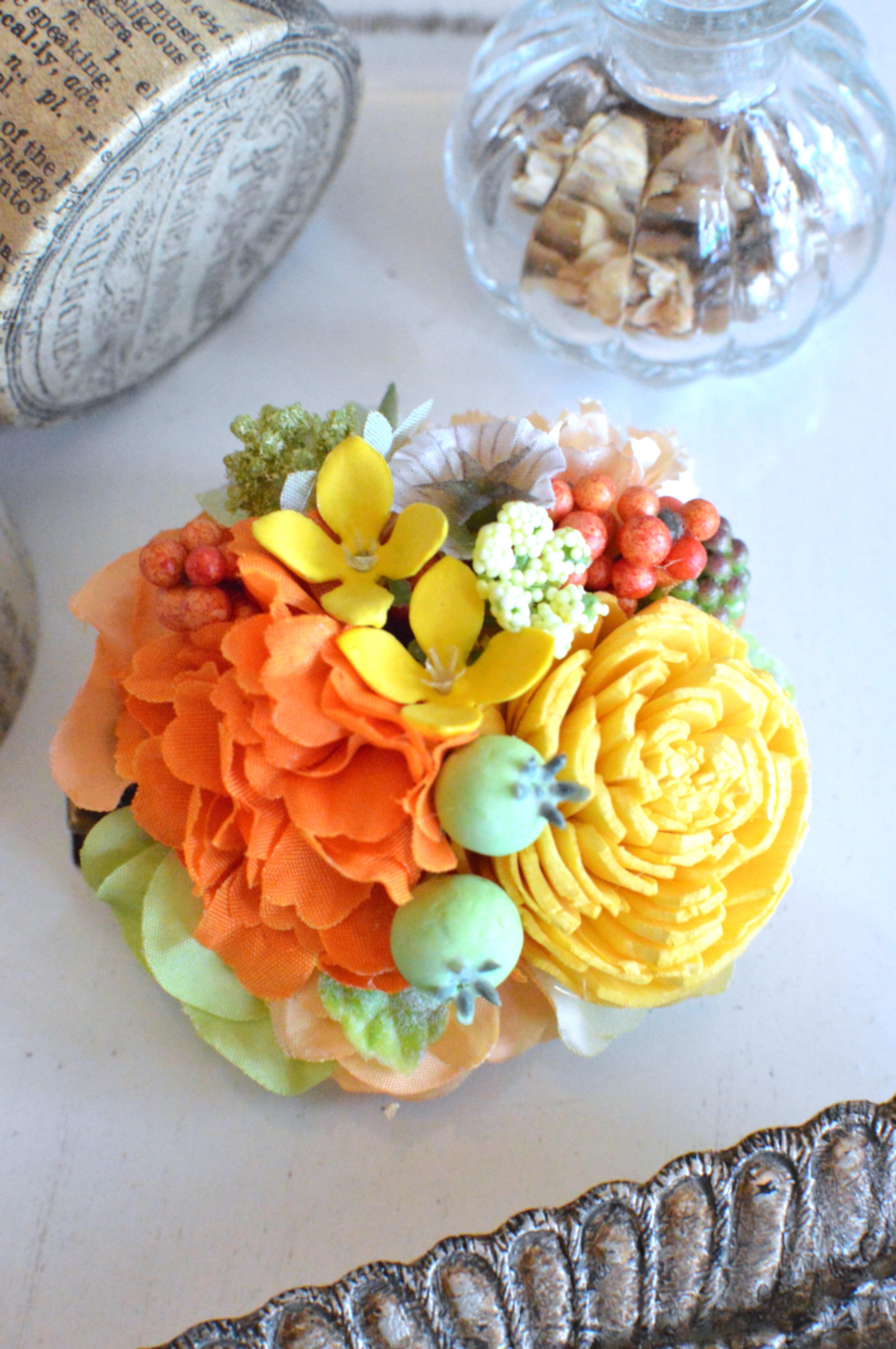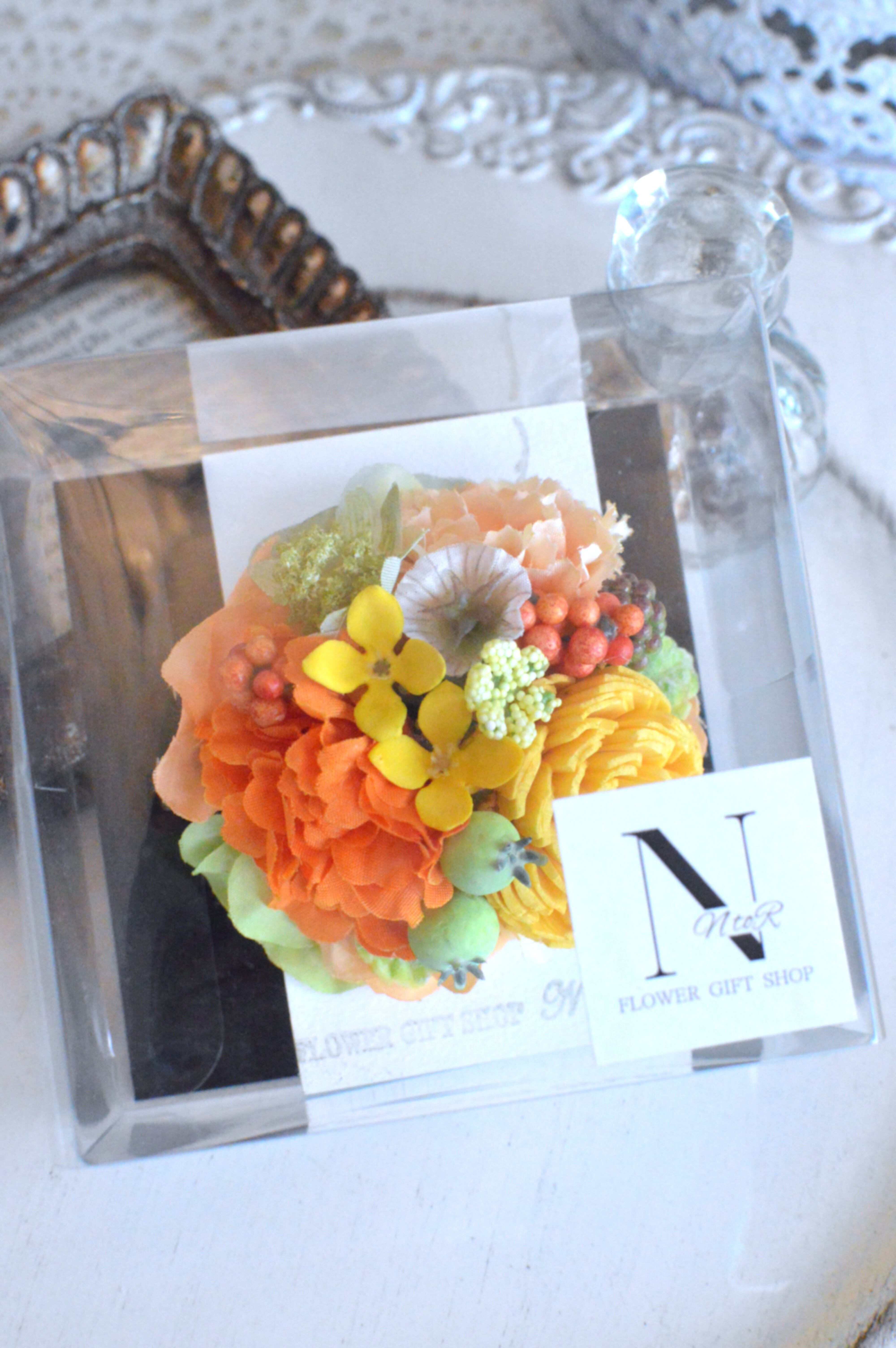 鮮やかなオレンジとイエローのビタミンカラーをメインに、差し色で合わせた淡いグリーンがより華やかさを際立たせてくれます。