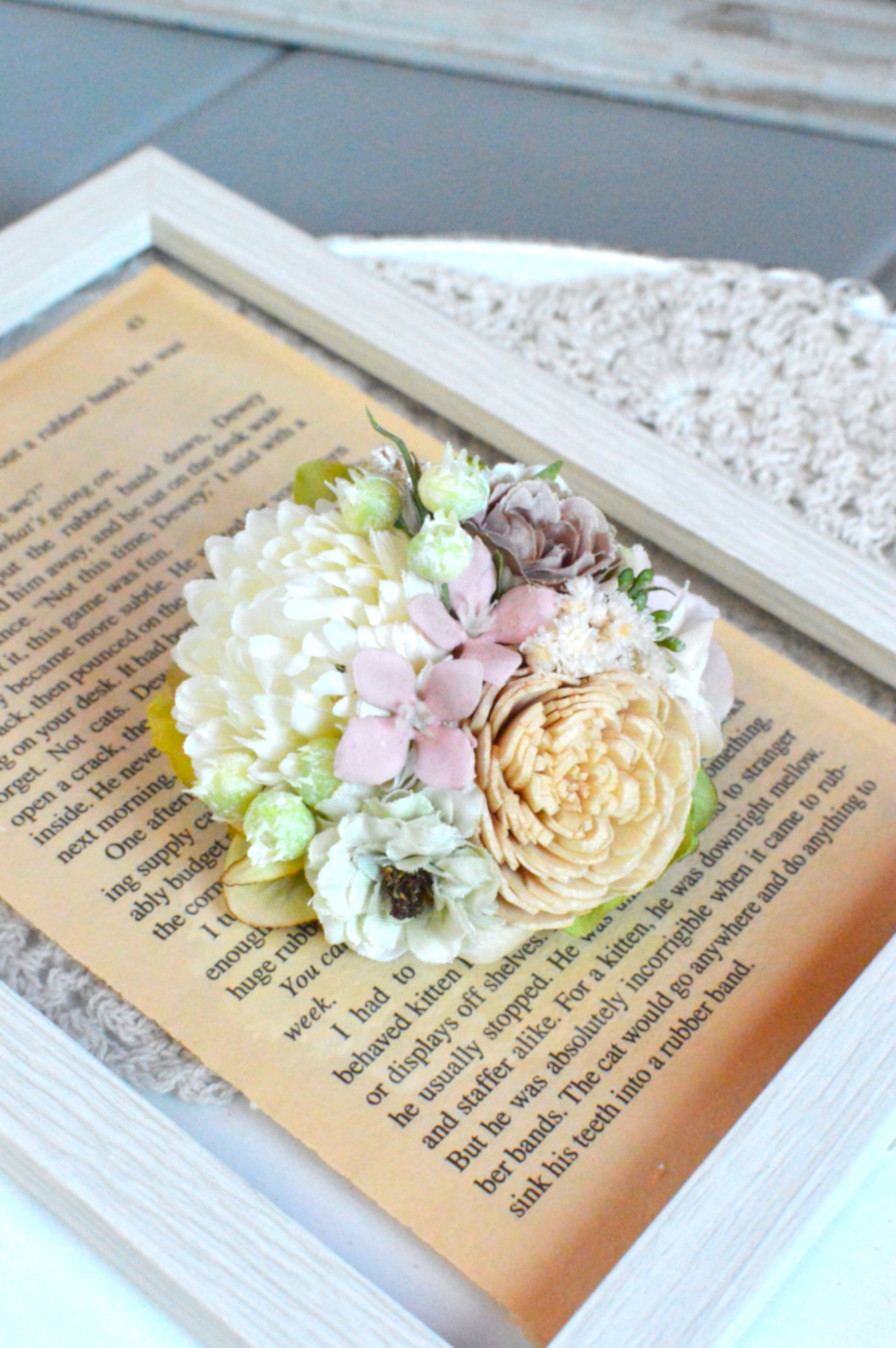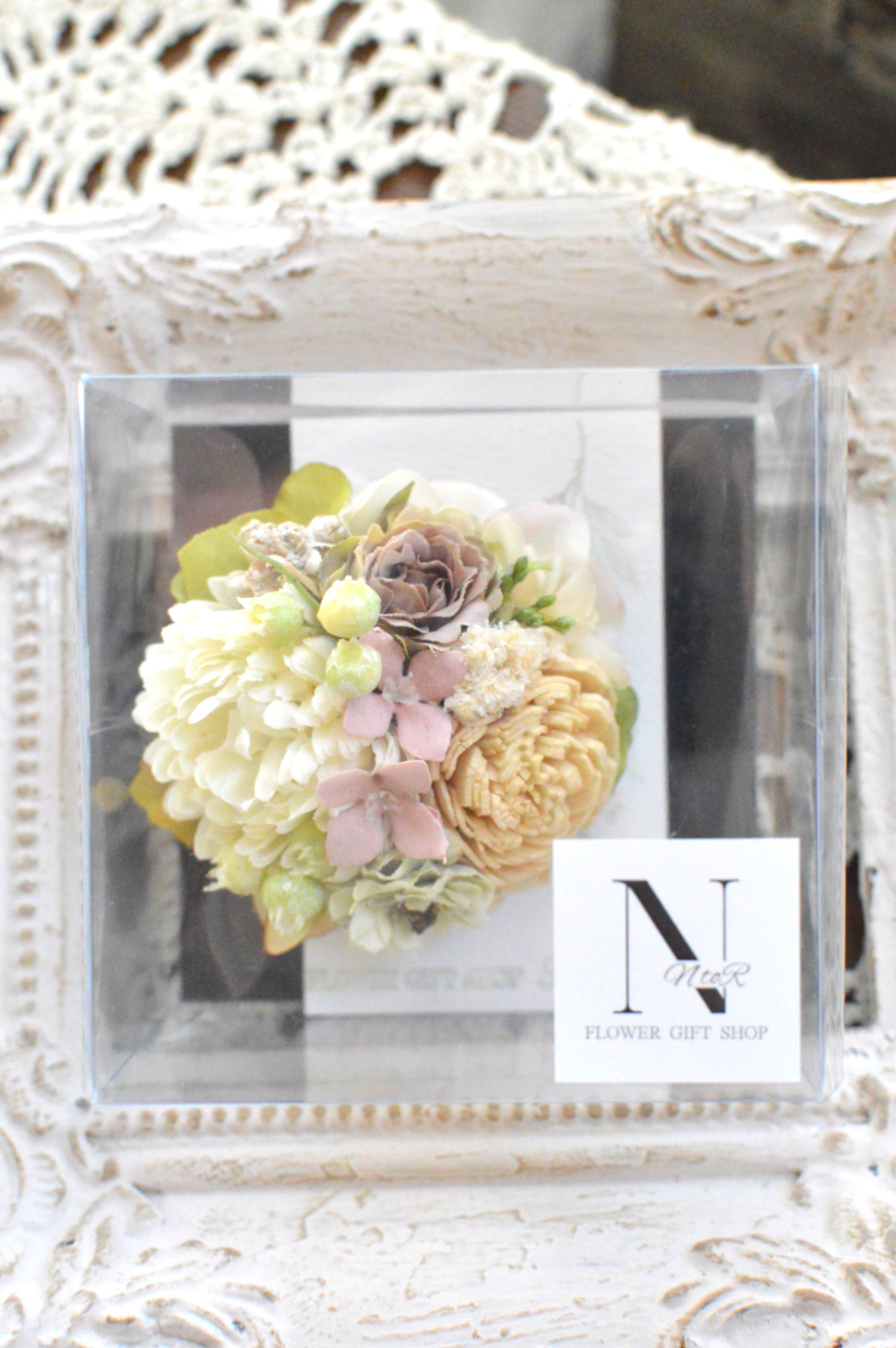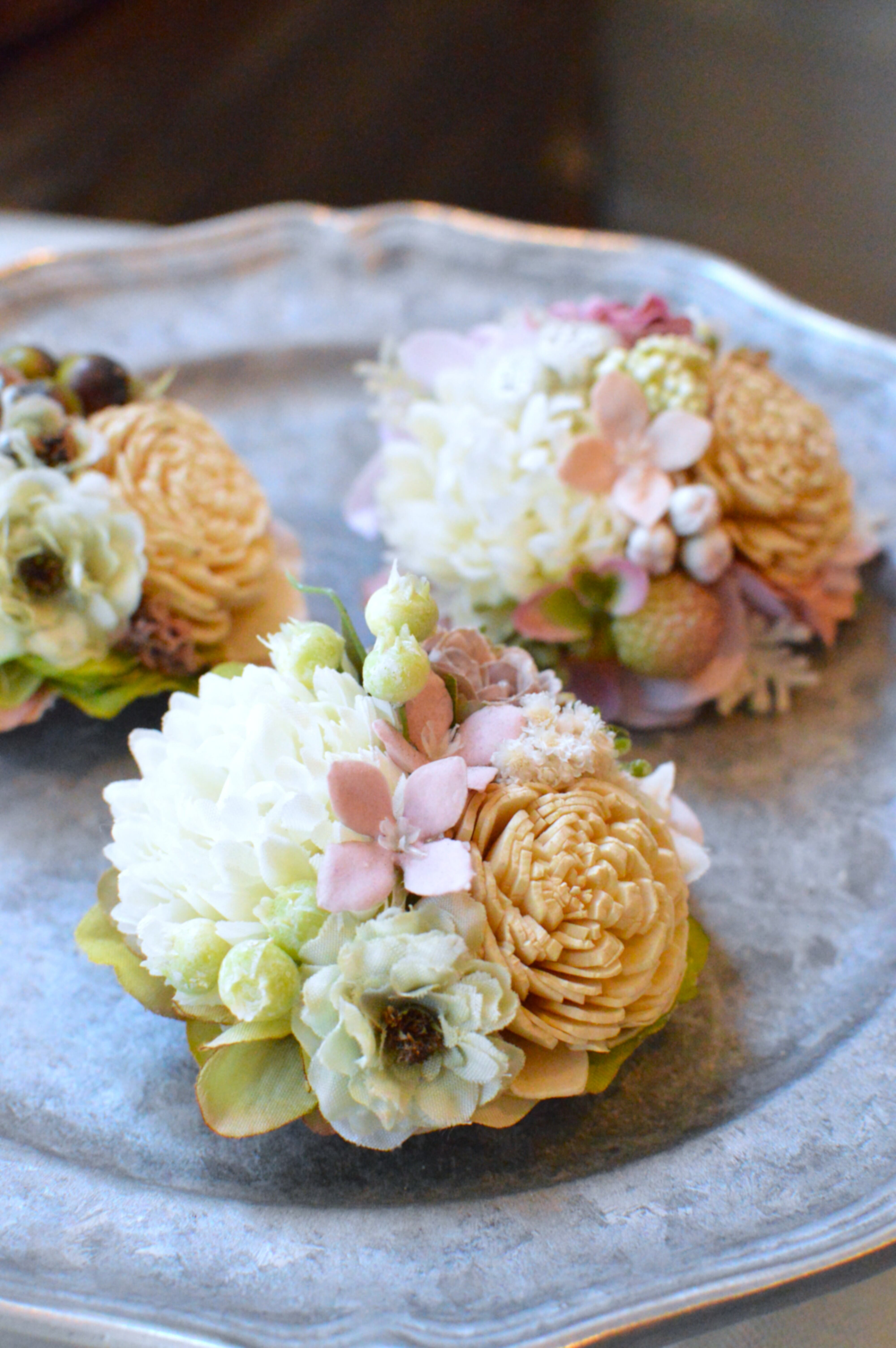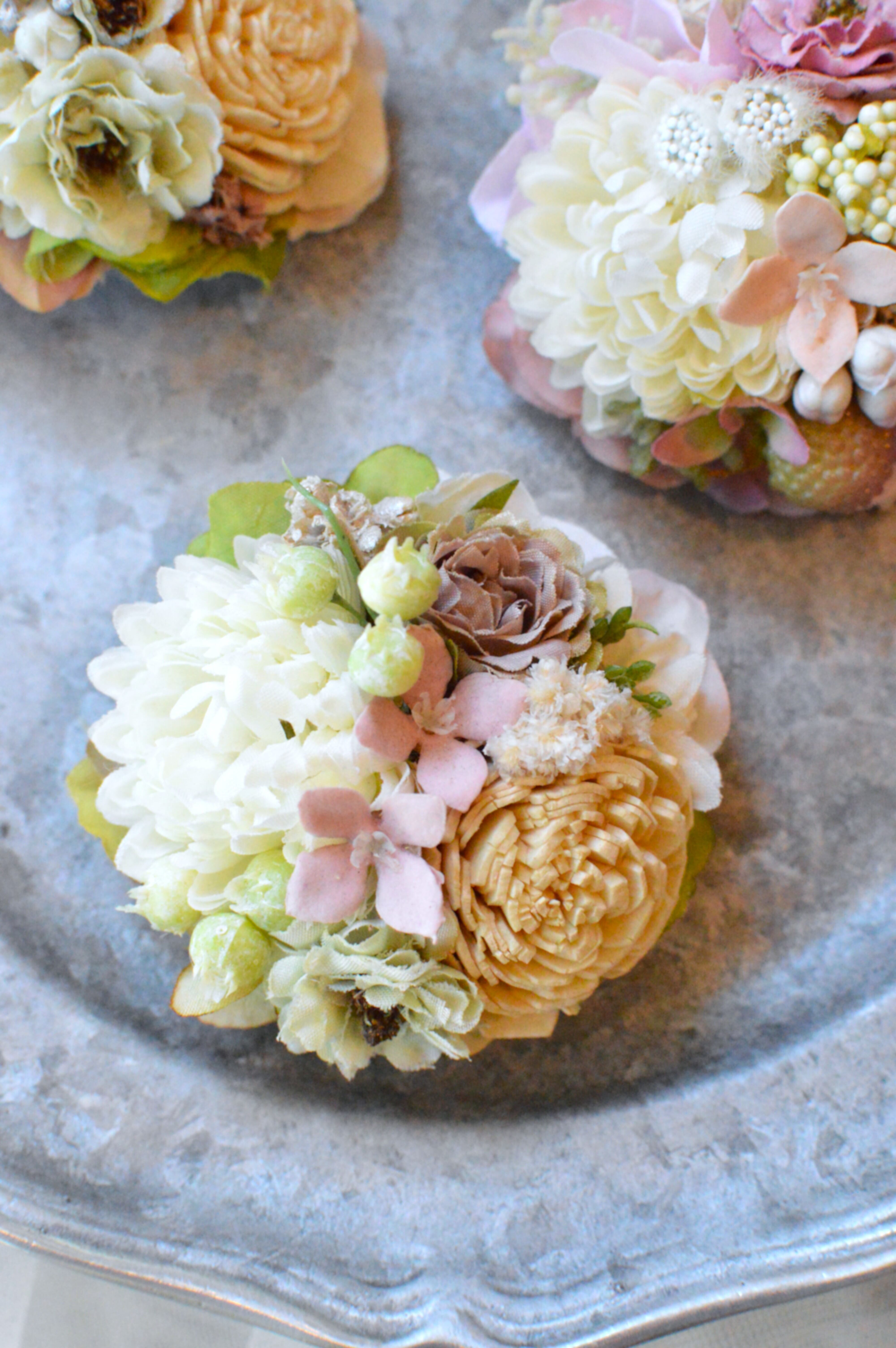 こちらはアーティフィシャルフラワー、ドライフラワーを使用して制作しております。