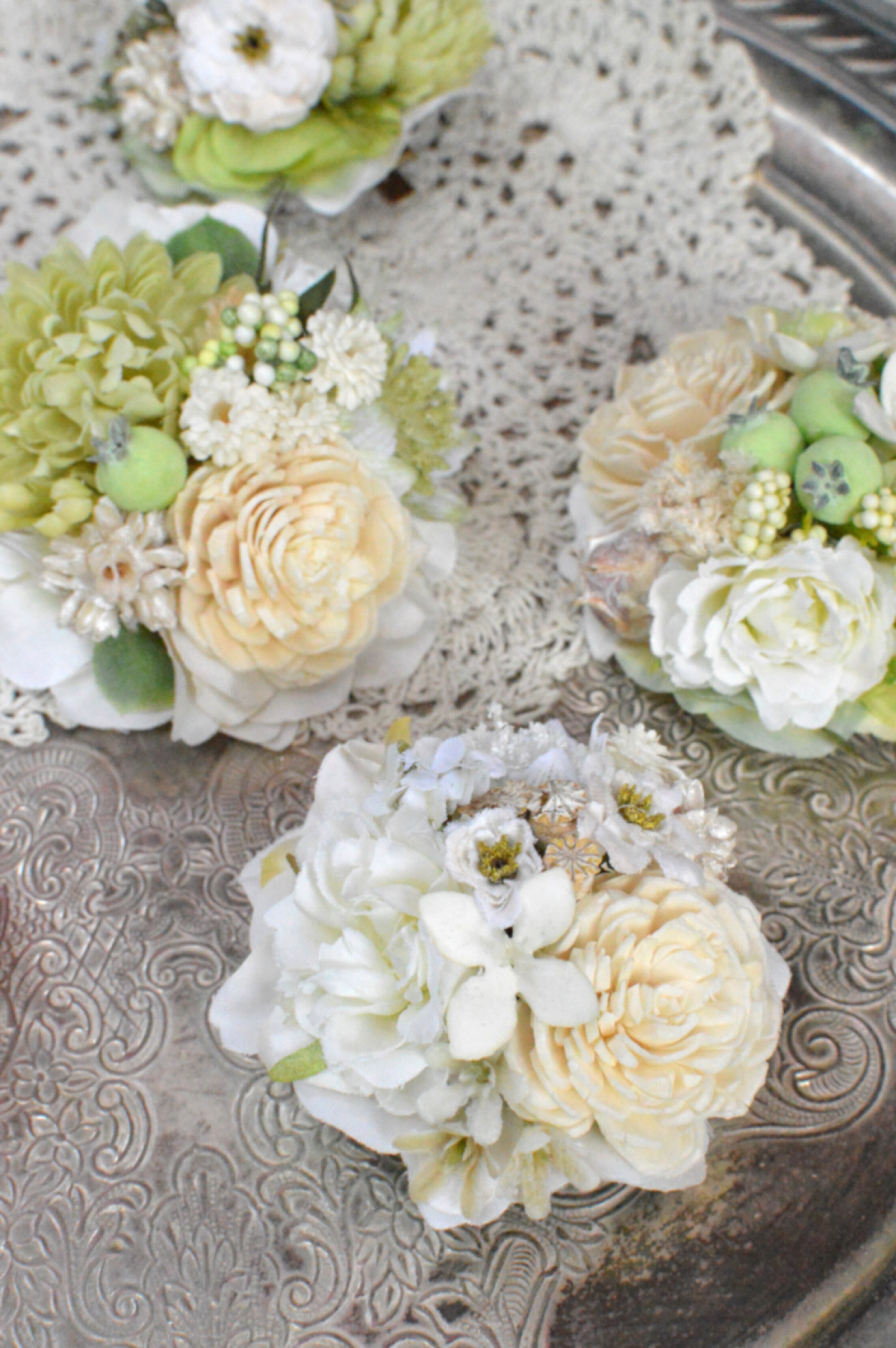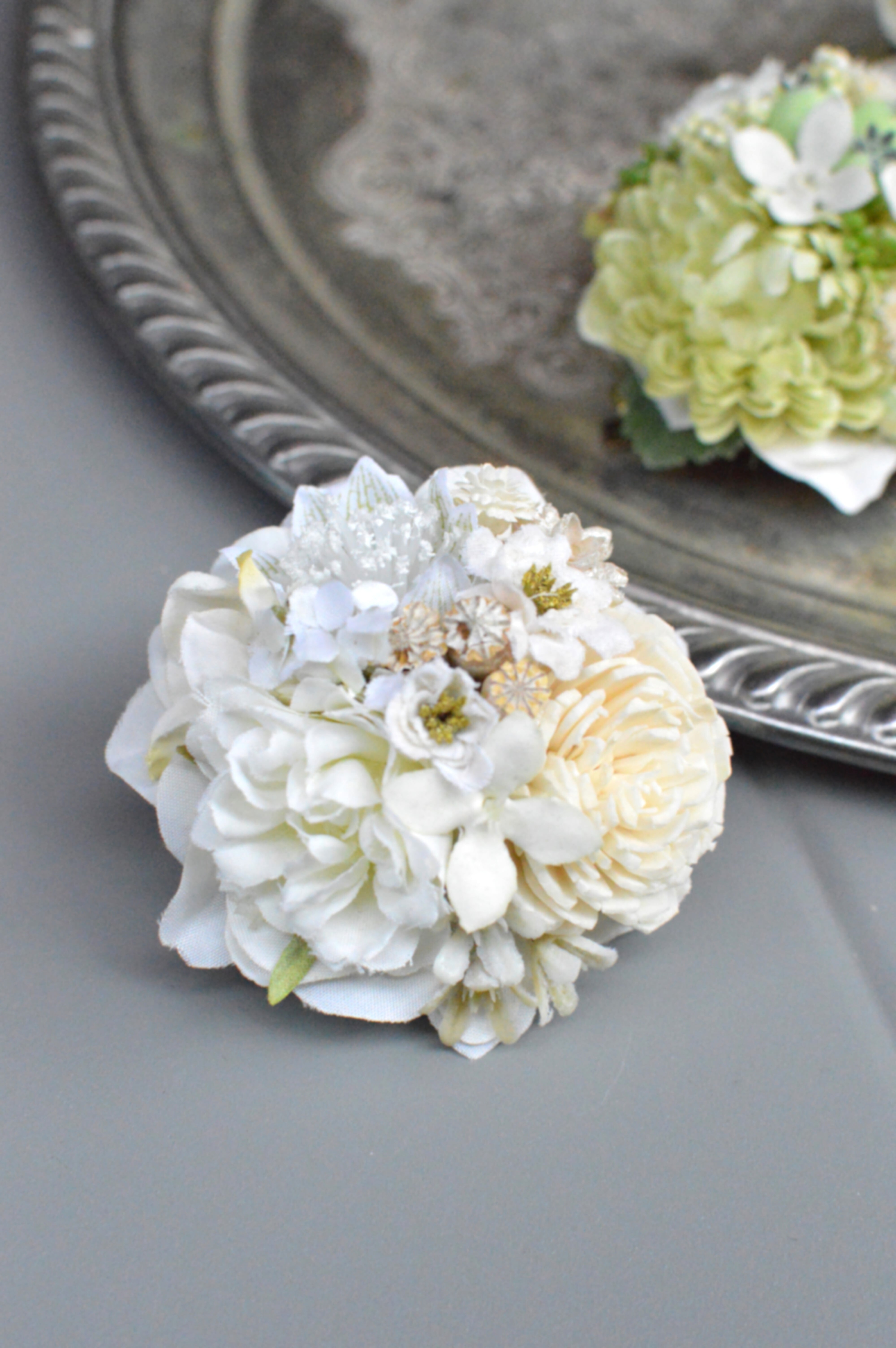 ニュアンスの違う白を組み合わせ、ナチュラルな仕上がりとなっております。花びらの模様やガクに淡いくすみグリーンが入っており、より白の優しさを引き立ててくれます。