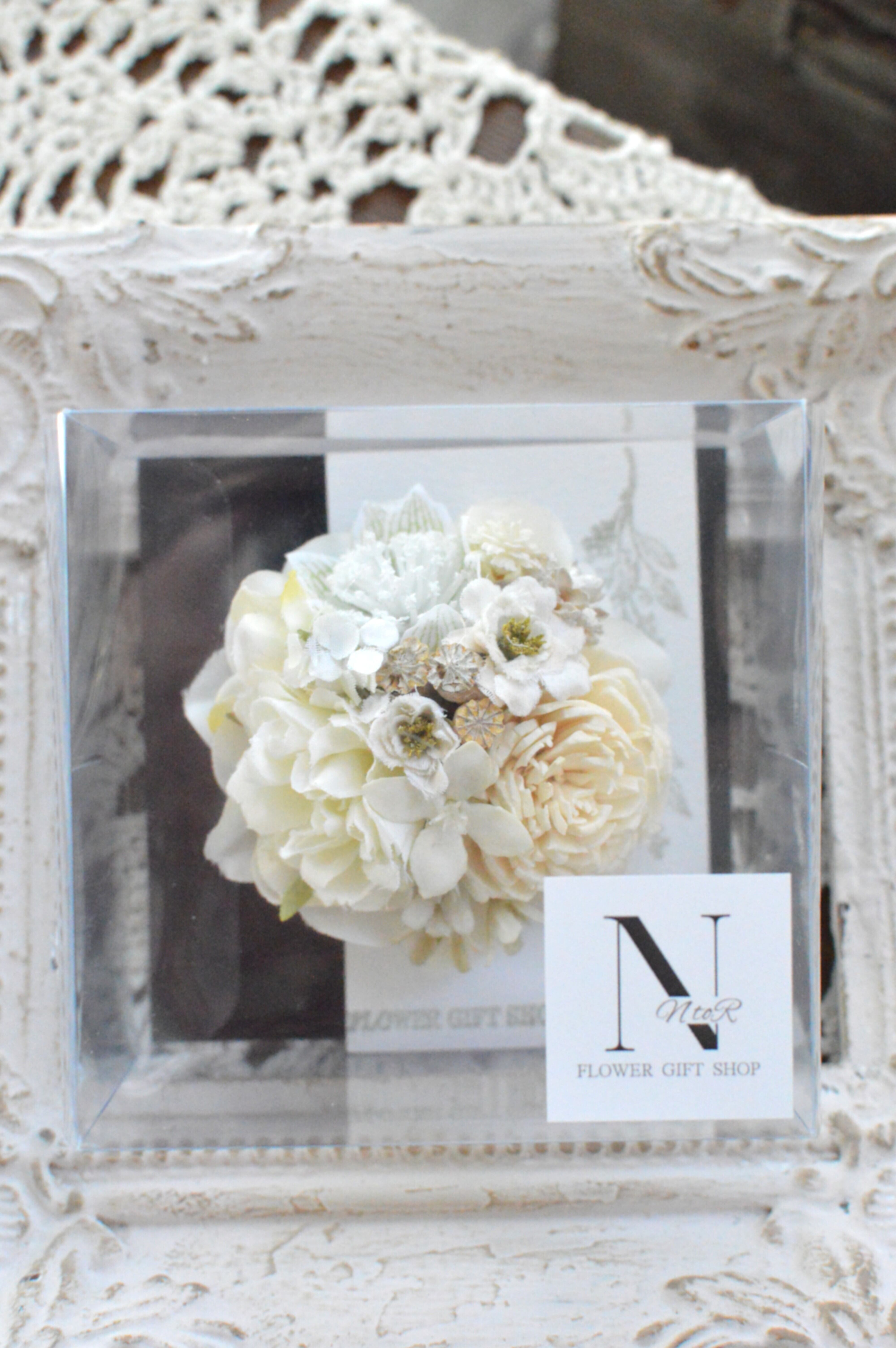こちらはアーティフィシャルフラワー、ドライフラワーを使用して制作しております。