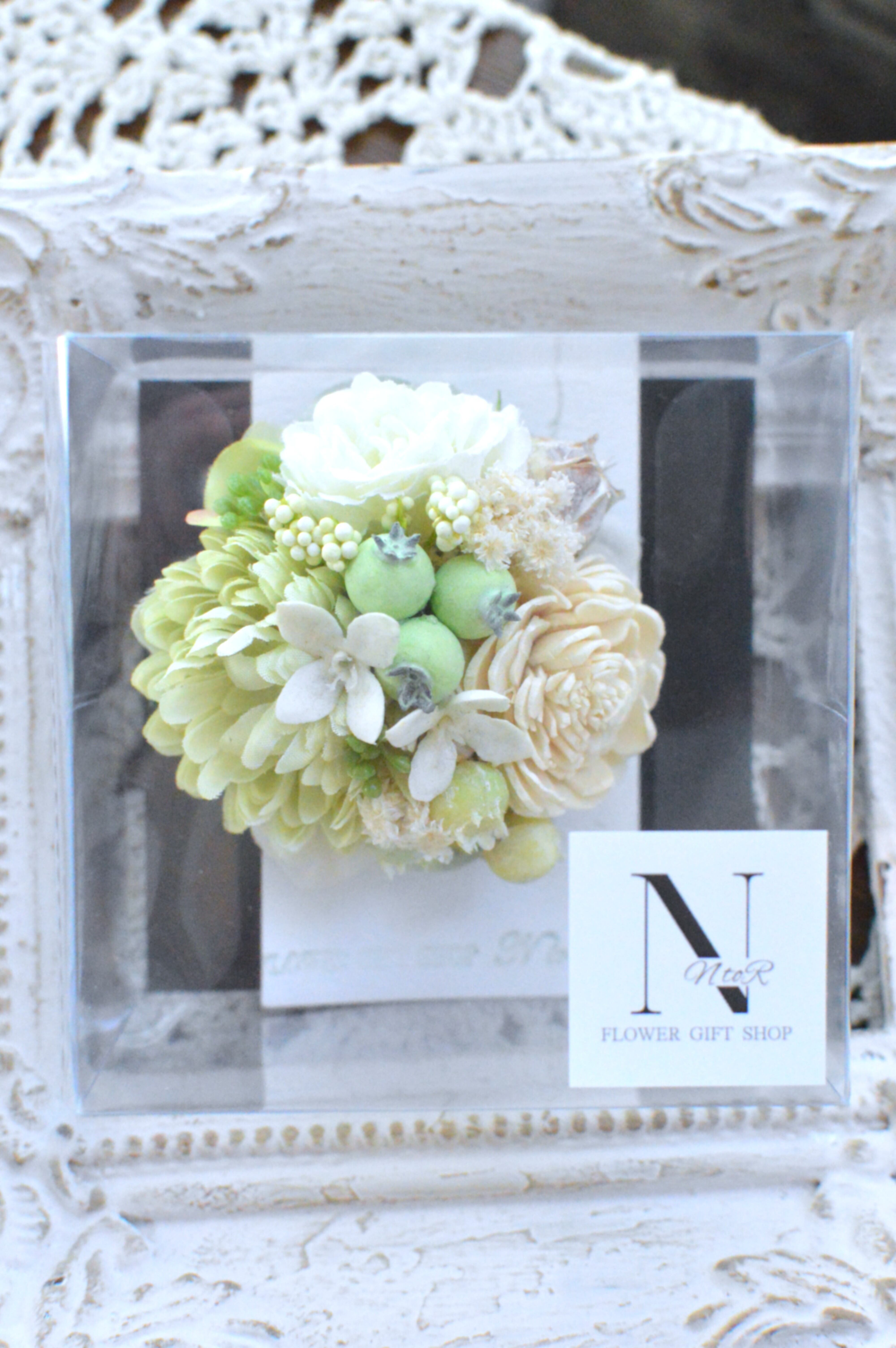 こちらはアーティフィシャルフラワー、ドライフラワーを使用して制作しております。