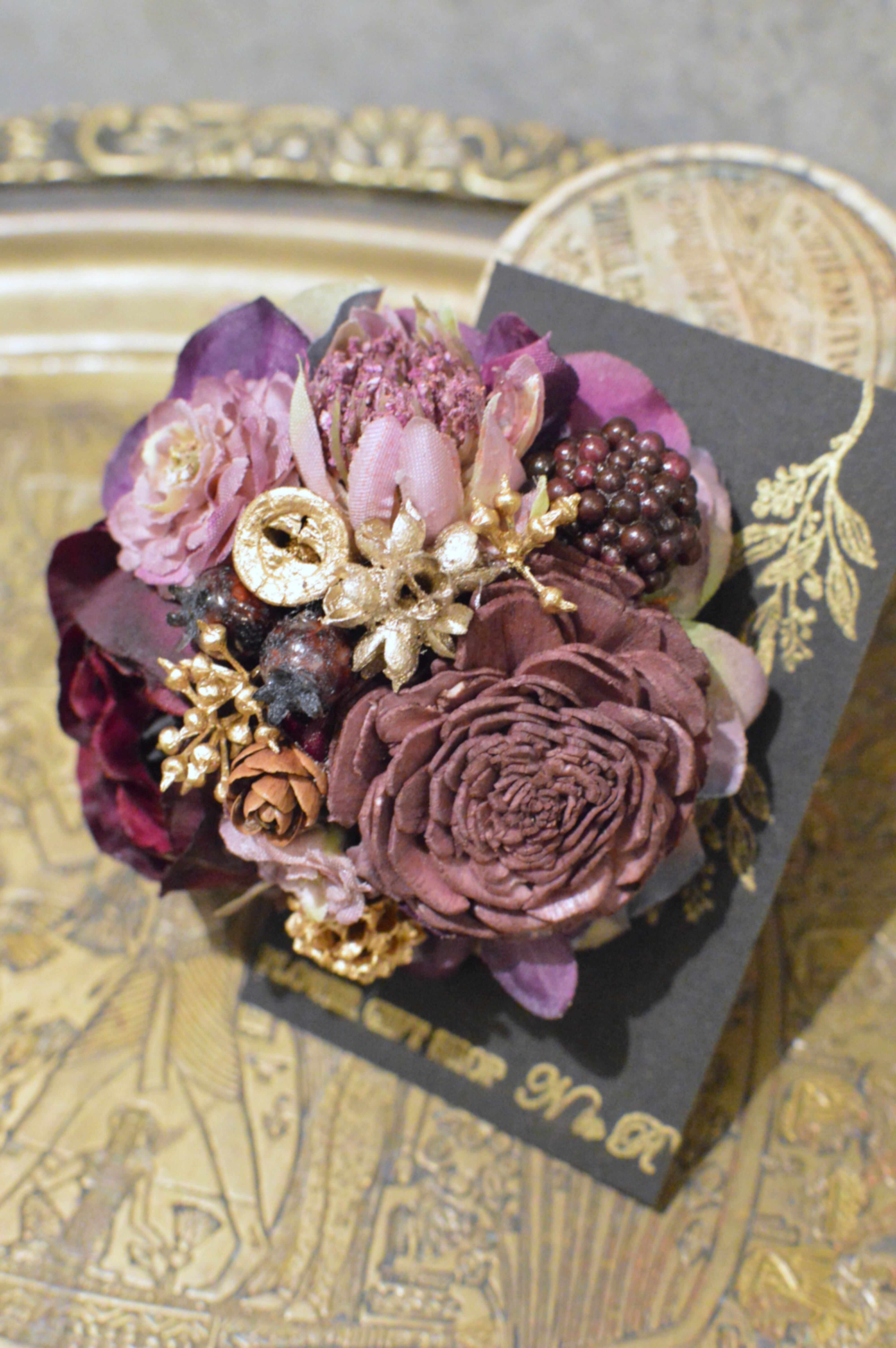濃い紫の色合いが特徴的で、シックでエレガントな雰囲気となっております。さらに、ゴールドの木の実をあしらってありますが、マットな色合いなので派手になりすぎず上品に華やかさをプラスしてくれます。
