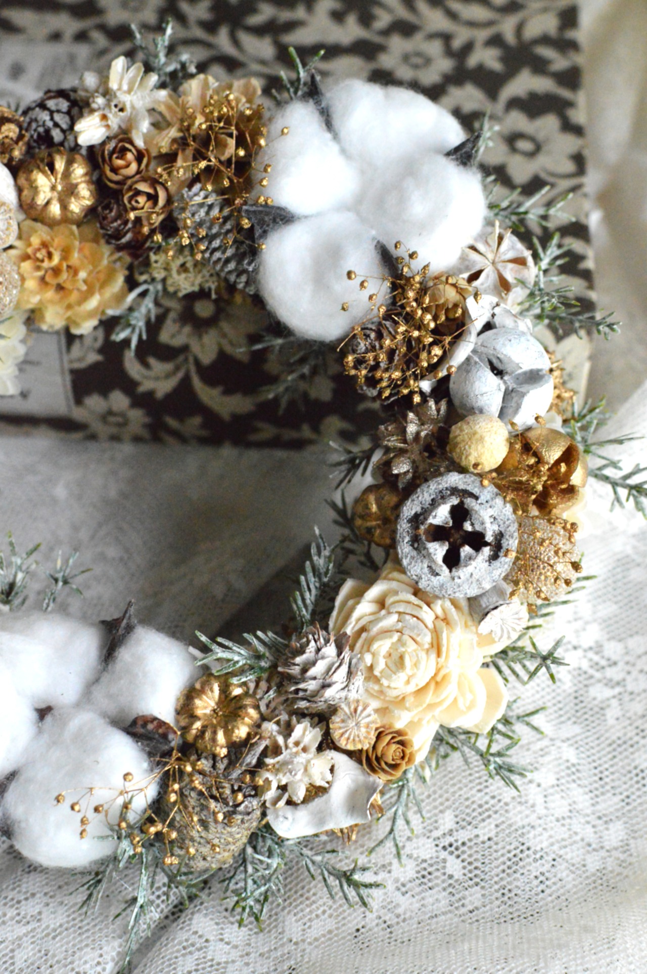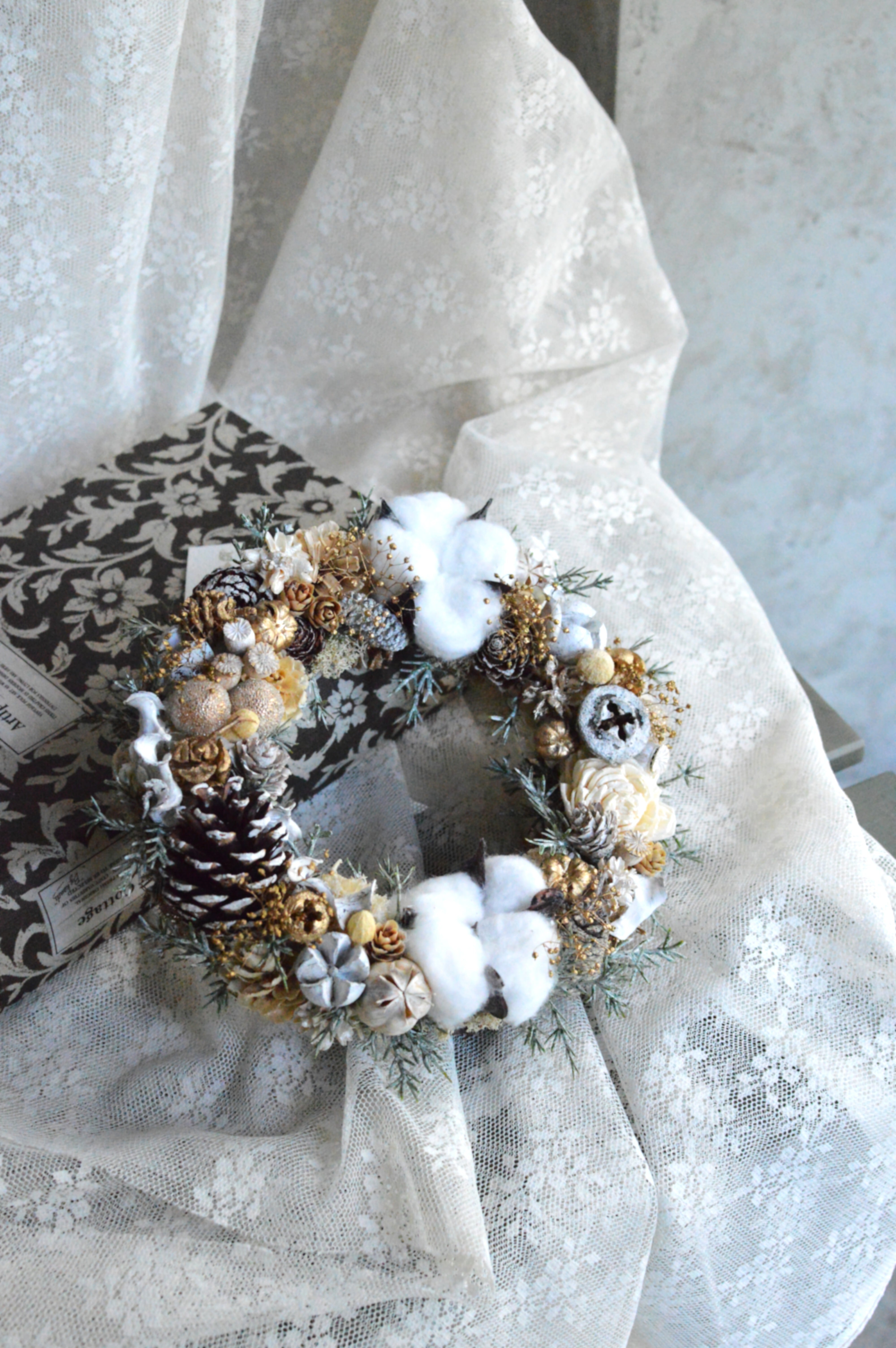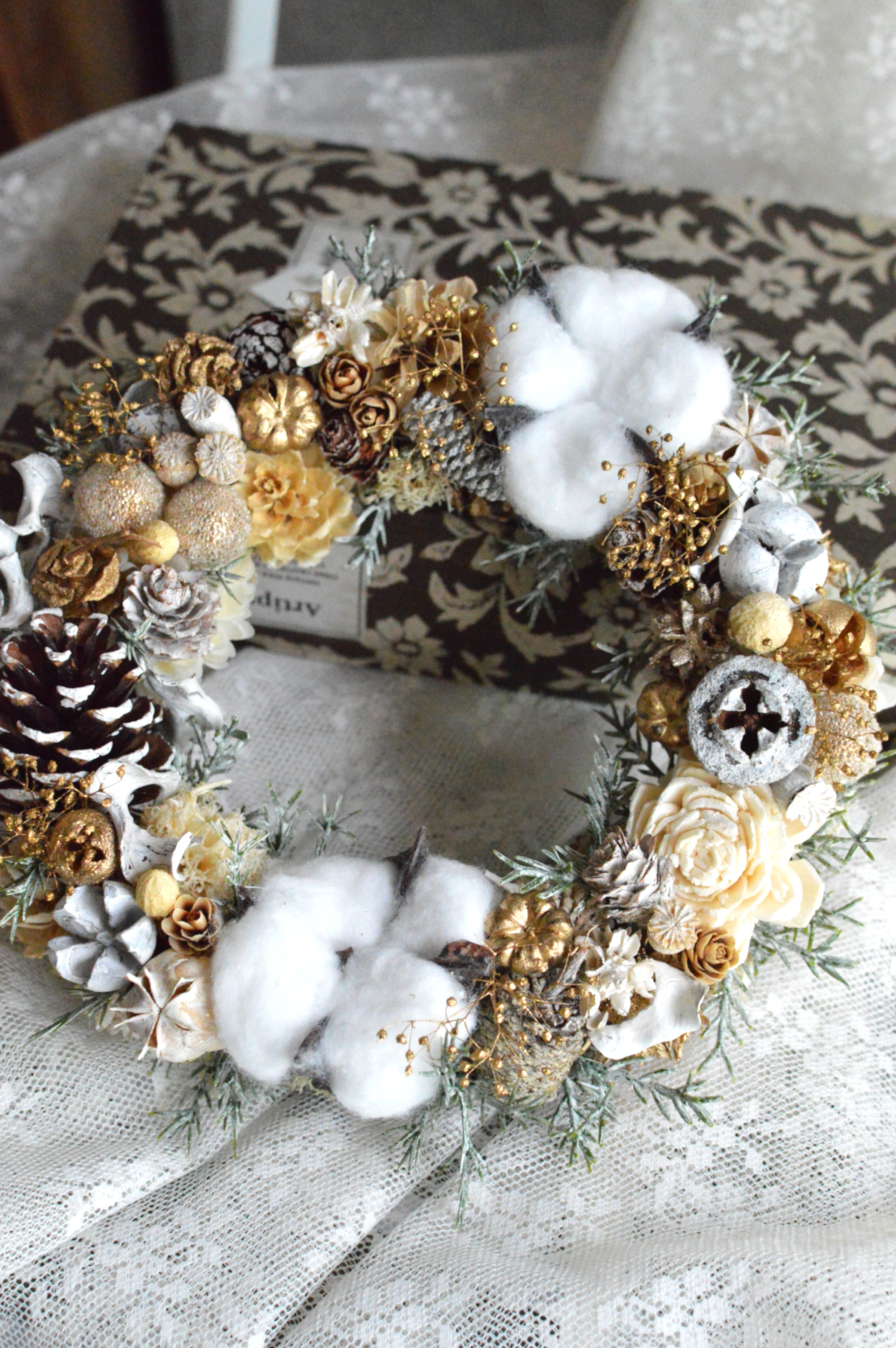 ドライの木の実やアーティフィシャルコットン、ベリー、グリーンを使用して、温かみのあるデザインに仕上げました。白くペイントした木の実やコットンが雪を連想させてくれます。