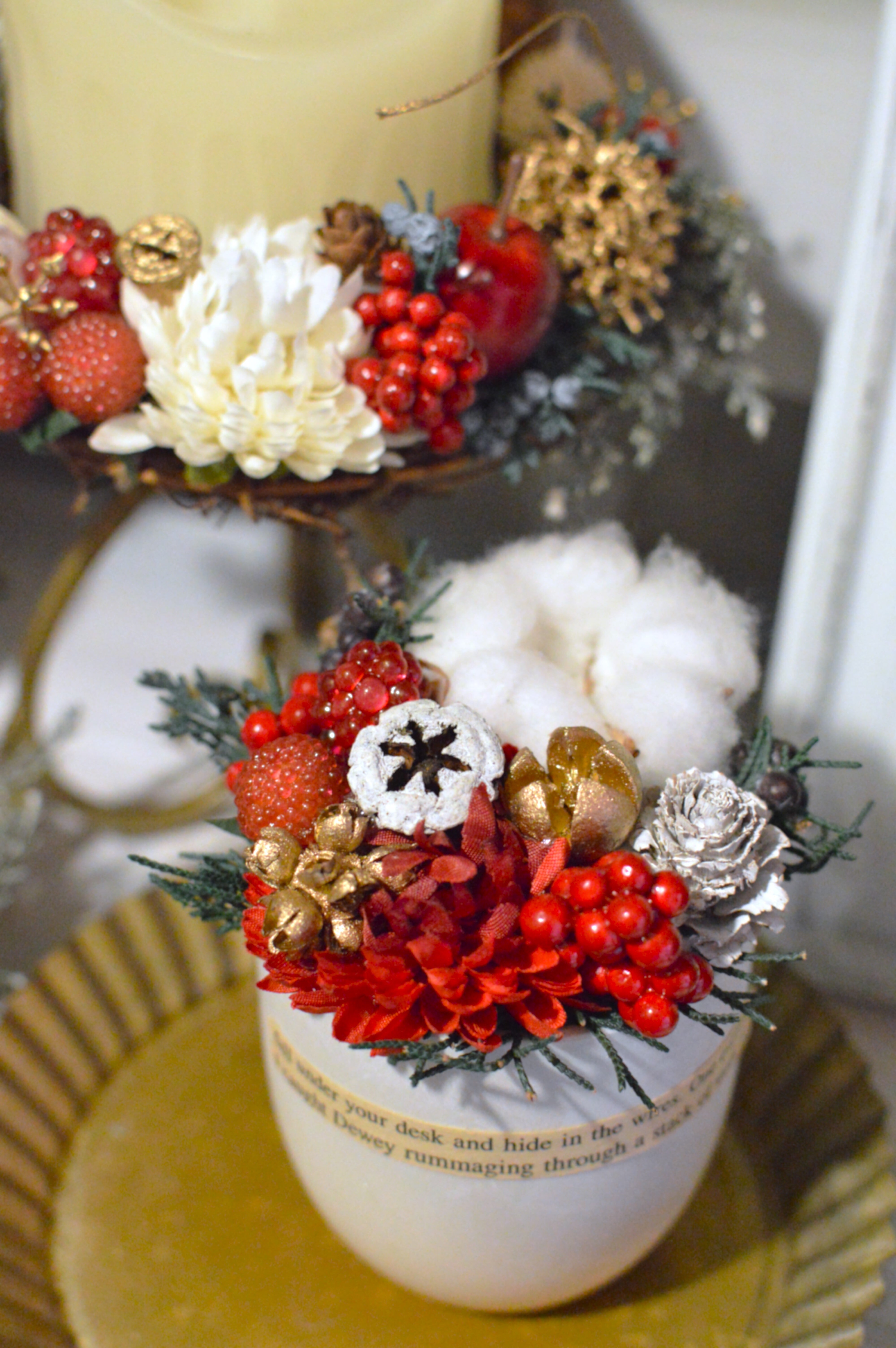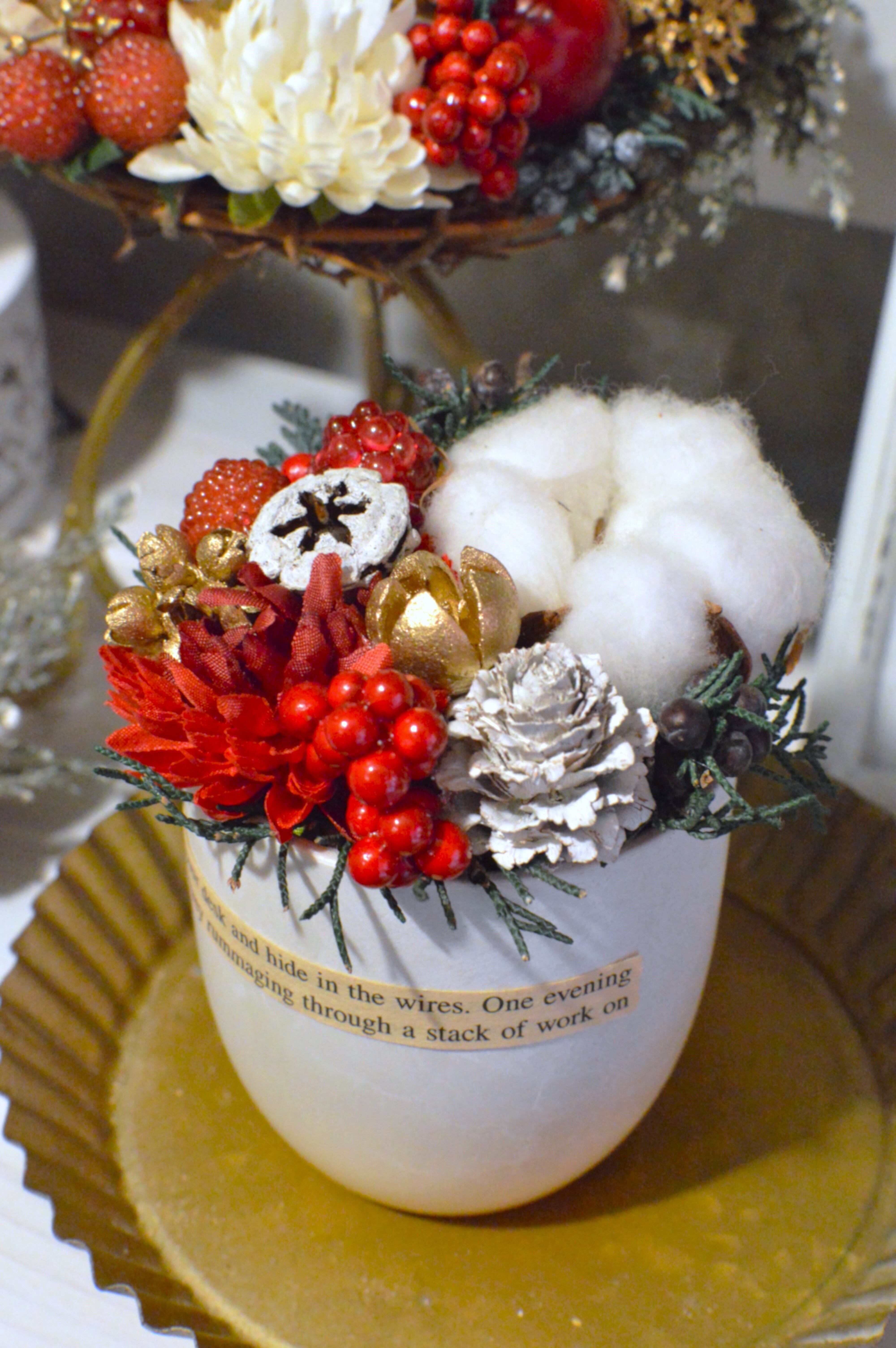 アーティフィシャルのコットンやベリー、ドライの木の実を使用し、ナチュラルで温かみのあるデザインに仕上げました。赤を基調とした可愛らしさと華やかな雰囲気です。